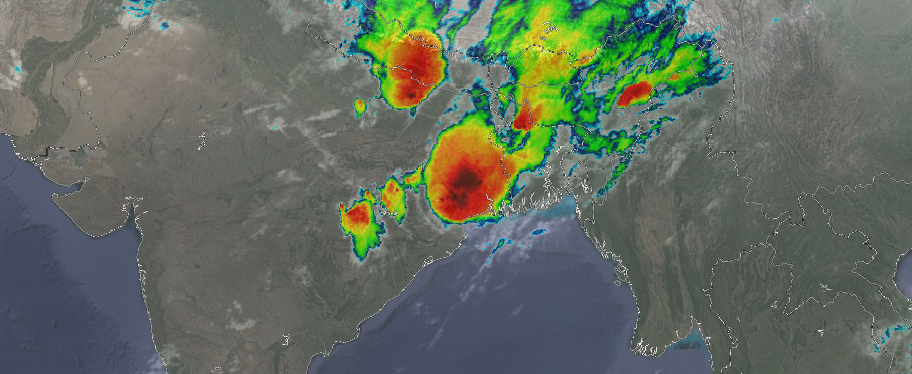 C’est ce mécanisme qui est observé sur ces régions depuis deux jours désormais, comme l’illustre le système orageux massif visible sur l’image satellite ci-dessus, prise le 20 avril 2020 à 23h TU. On y voit un système convectif de méso-échelle (MCS) très actif sur le Bengale Occidental (extrême nord-est de l’Inde) et sur le point d’entrer sur le Bangladesh. Ce système a échappé de peu à une classification en MCC (complexe convectif de méso-échelle), soit le stade ultime des systèmes orageux de grande envergure.