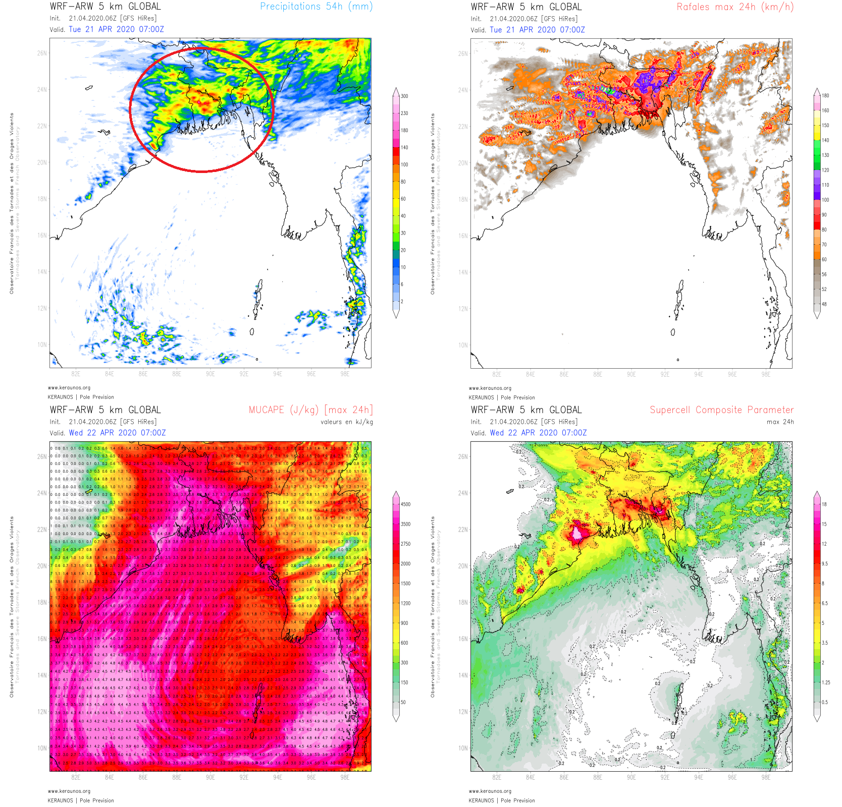 Cette situation devrait perdurer encore au moins une semaine, avec des niveaux d’intensité orageuse variables selon les jours. D’ici jeudi, le modèle WRF-ARW 5 km Global de Keraunos suggère une situation très active, génératrice de fortes pluies (localement plus de 100 mm en deux jours) et surtout de violentes rafales de vent (pointes localement supérieures à 160 km/h), qui doivent faire surveiller de possibles occurrences de derechos. On note par ailleurs de très fortes valeurs de MUCAPE (localement plus de 4000 J/kg), ainsi que des hauts niveaux de Supercell Composite Parameter, qui confirment un potentiel orageux sévère. Des chutes de grêlons parfois supérieurs à 5 cm de diamètre sont attendues dans ce contexte, ainsi qu’un risque localisé de tornades, notamment côté indien, à l’ouest et au nord de Calcutta.