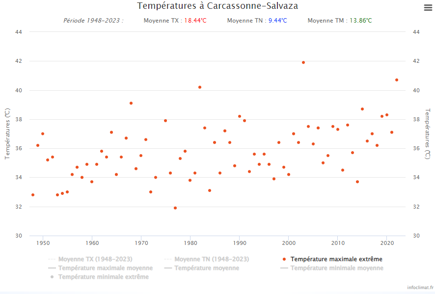 A Carcassonne, il a fait 40.3°C. Sur cette station synoptique, les 40°C n'ont été atteints que 5 fois (une fois en juillet 82, deux fois en août 2003, une fois en août 2022) - (cf graphe de droite, source Infoclimat).