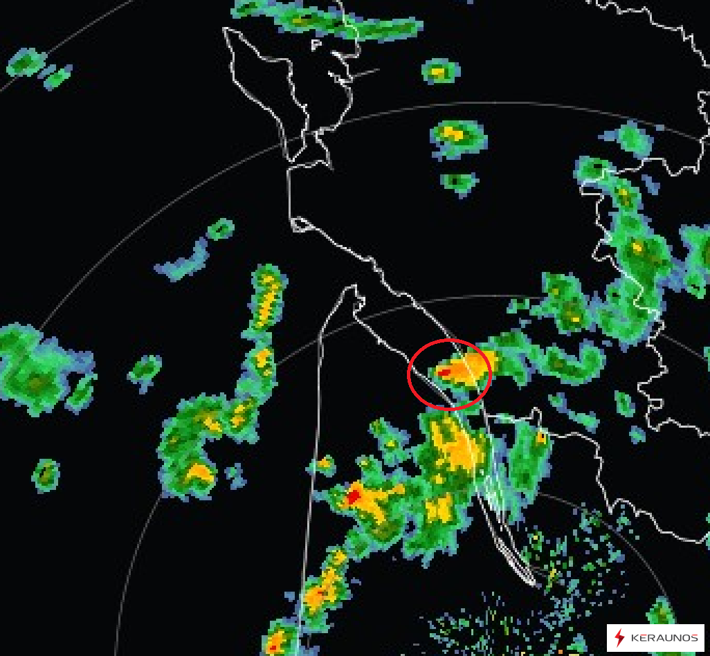 Les images radar confirment la présence d'une cellule convective active à cet endroit vers 11h30 locales. Elle présente une alimentation rétrograde pendant une vingtaine de minutes, dans la partie centrale de l'estuaire, avant d'être reprise dans le flux et de gagner la Charente-Maritime. C'est pendant cette période quasi stationnaire, liée à une double pulsation convective, qu'un dipôle de vitesses radiales est perceptible au radar Doppler, sur le flanc ouest/nord-ouest de la cellule.