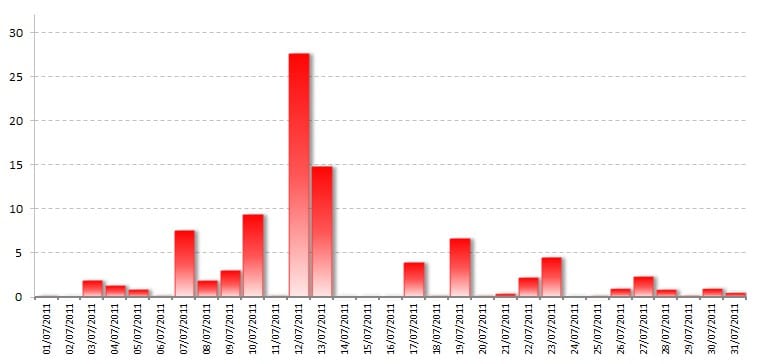 Le mois de juillet 2011 a présenté une activité orageuse généralement faible, tout particulièrement durant la seconde quinzaine, qui est particulièrement pauvre en phénomènes orageux. Les niveaux d'activité convective sont en repli très net par rapport aux mois de juillet 2009 et 2010.