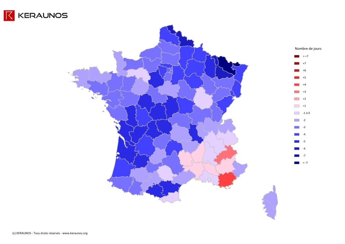 Les déficits d'activité orageuse sont particulièrement élevés de la Gironde à la Bretagne, jusqu'à la Normandie et au Nord - Pas de Calais. L'essentiel de l'activité orageuse a en effet concerné les départements qui s'étirent du Massif Central au Jura et aux Alpes. Seul le sud du massif alpin a observé une activité orageuse relativement régulière durant ce mois.