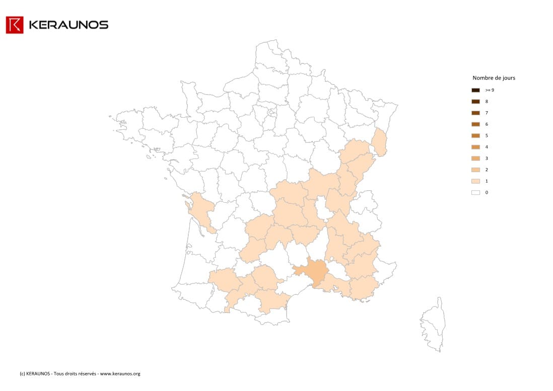 - le 10 juillet : des orages ponctuellement forts affectent le sud-est du pays, et plus particulièrement les départements de la Haute-Loire et du Gard, notamment en raison de chutes de grêle significatives.