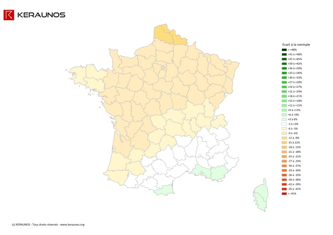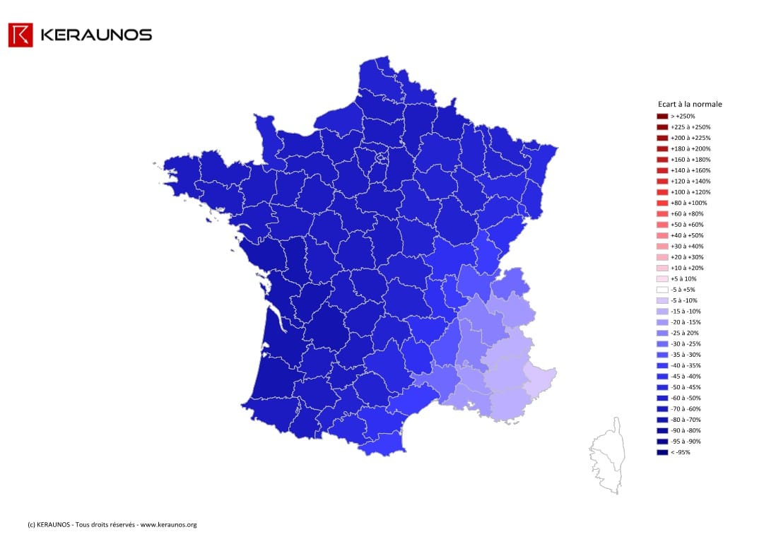 Parallèlement, les contenus en eau précipitable sont également inférieurs à la norme, sauf sur le rivage méditerranéen, où ils sont proches des normales (infime excédent).