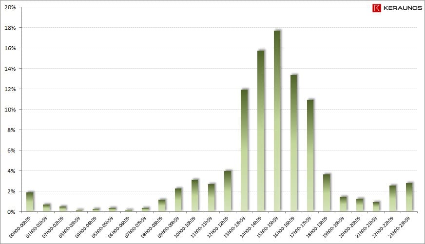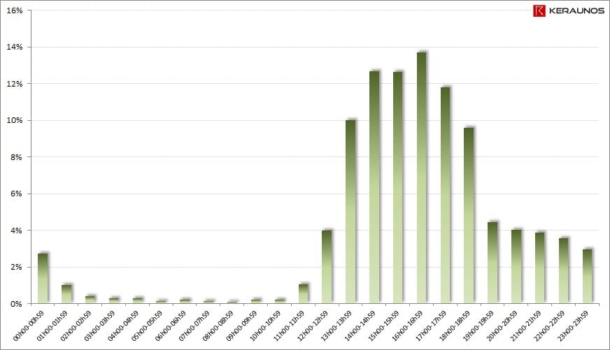Répartition horaire des impacts de foudre détectés au cours du mois et nombre quotidien de communes impactées par au moins une chute de foudre