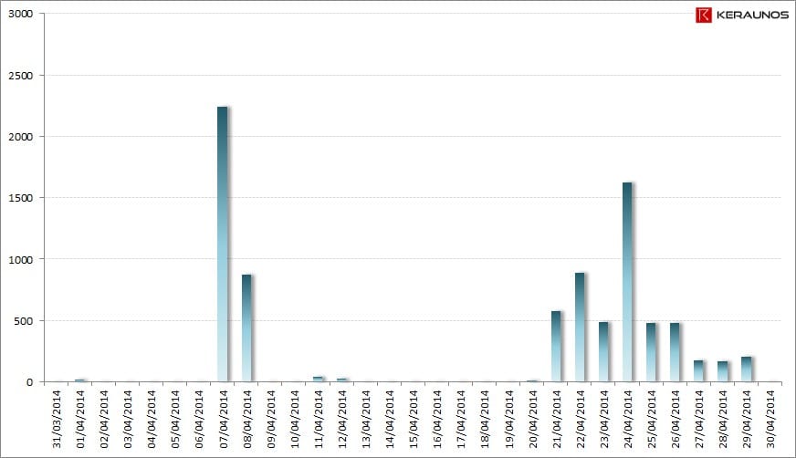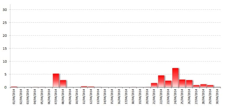 A échelle nationale, l'ISO* moyen mensuel ressort à 1,13 soit une valeur intermédiaire entre les mois d'avril très orageux (2009, 2011 et 2012 dont l'indice dépassait 2 et les mois d'avril moins orageux (2010 et 2013) dont l'ISO était inférieur à 1..La journée la plus orageuse de ce mois est celle du 24 avril, avec un ISO de 7,4.