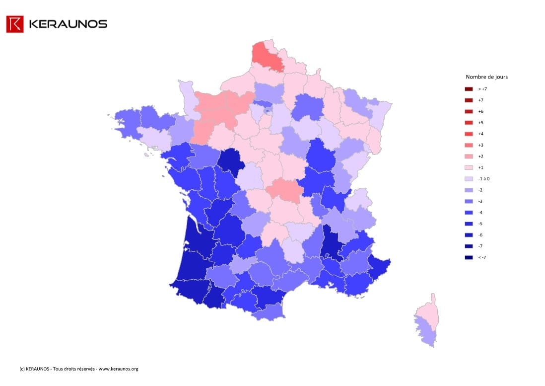 Les orages ont été plus nombreux du nord de la Seine à la Normandie et des Ardennes au Massif-Central. A contrario, on note un déficit marqué par rapport à la moyenne 2009-2013 sur la frange ouest du territoire, près des Pyrénées et du Val de Saône aux régions méditerranéennes.particulièrement nombreux pour un mois d'hiver sur tout l'ouest et le nord du pays, ainsi qu'aux abords de la vallée du Rhône. On enregistre jusqu'à 7 jours avec orage sur les départements de l'Orne et de l'Oise.