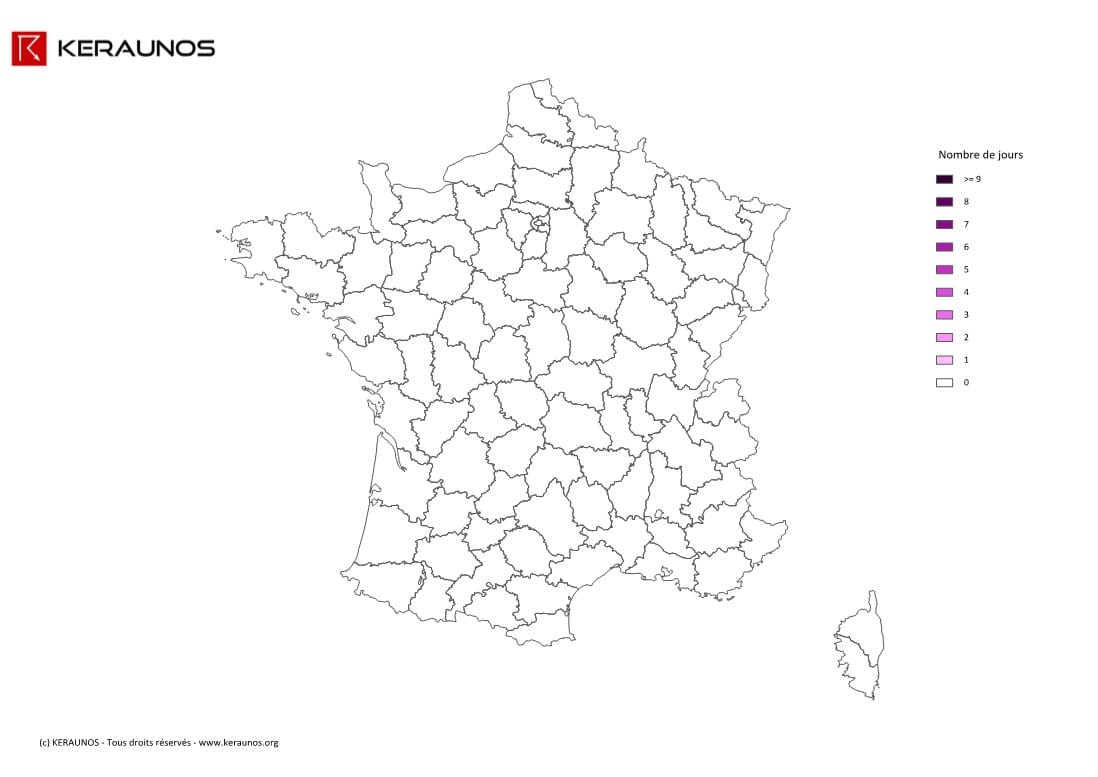 3 jours avec orage fort ont été recensés durant ce mois. En revanche, aucun orage violent ni extrême n'a été répertorié.