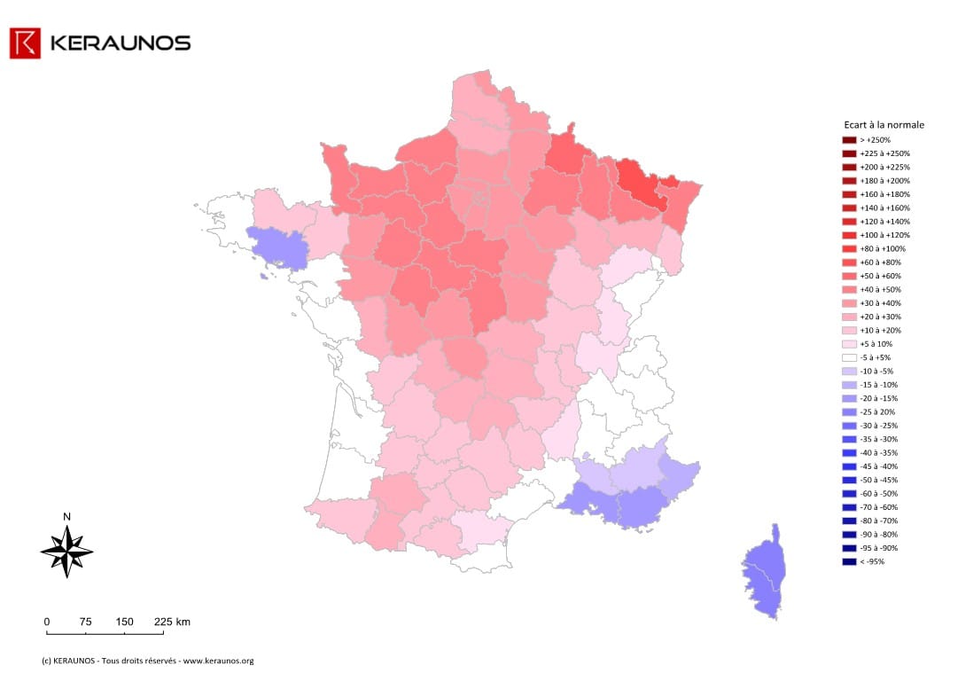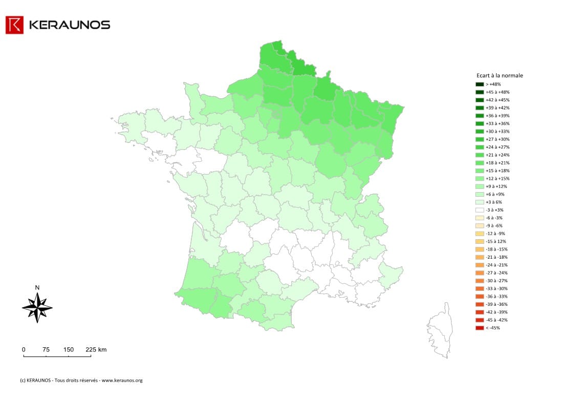Les contenus en eau précipitable ont été partout excédentaires mais cet excédant est bien moins marqué de l'estuaire de la Loire aux régions proches de la Méditerranée. A contrario, il est particulièrement significatif près des frontières du nord-est.