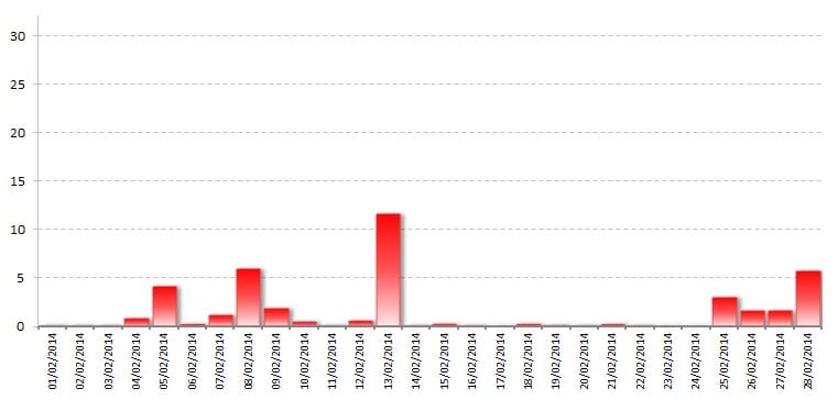 Dans la lignée du mois de janvier, et concluant un hiver très instable, le mois de février 2014 a été caractérisé par un nombre de jours avec orage très élevé. De multiples phénomènes venteux et plusieurs tornades ont été à nouveau observés durant le mois, comme le mois précédent.