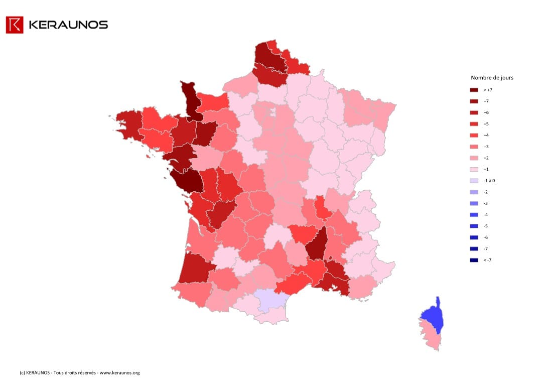 Nombre de jours avec orage (à gauche) et écart à la moyenne 2009-2013 (à droite)