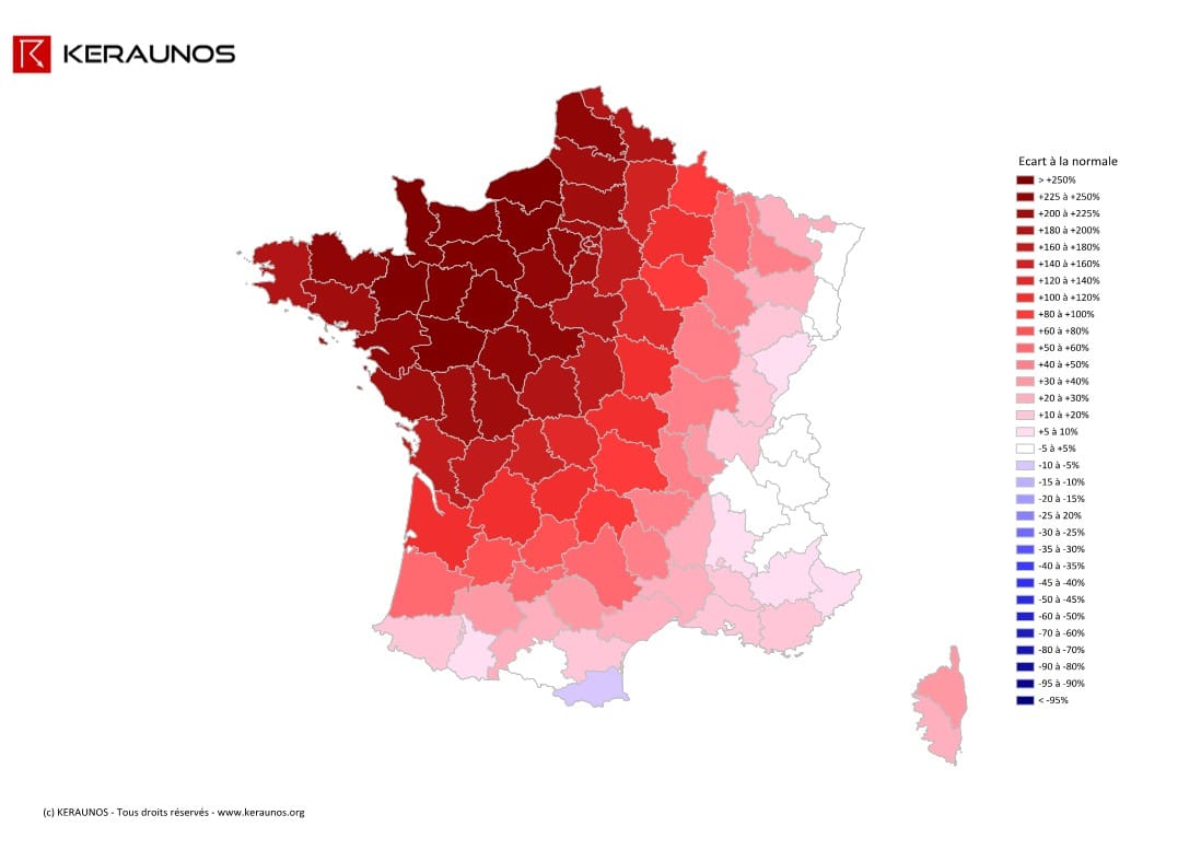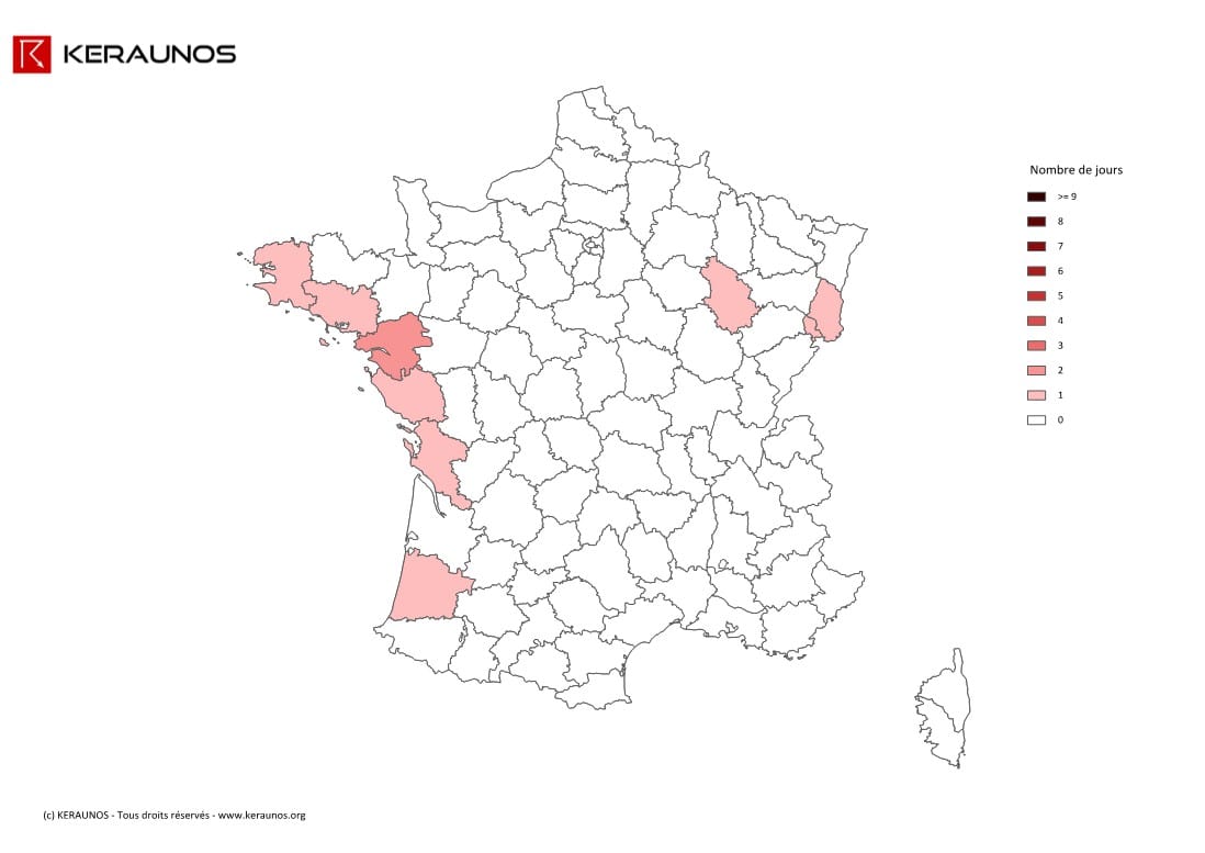 Les orages ont été particulièrement nombreux pour un mois d'hiver sur tout l'ouest et le nord du pays, ainsi qu'aux abords de la vallée du Rhône. On enregistre jusqu'à 11 jours avec orage sur le département de la Manche.