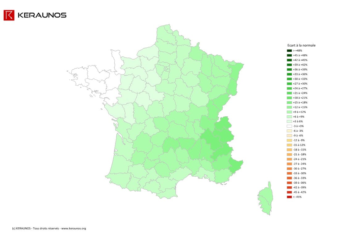 A l'inverse, les régions qui s'étirent de la Franche-Comté à Champagne-Ardennes s'illustrent par une activité orageuse quasi inexistante, ce qui n'est toutefois pas exceptionnel en cette période de l'année.