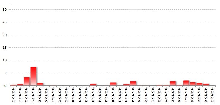 Le mois de janvier 2014 a été caractérisé par un nombre de jours avec orage supérieur à celui observé ces dernières années. Par ailleurs, ces orages ont parfois été forts (en raison de violentes rafales ou de tornades) puisqu'avec 5 jours d'orage fort et 2 jours d'orage violent, il s'agit du mois de janvier le plus actif de ces dernières années.