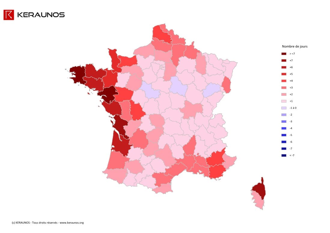 Nombre de jours avec orage (à gauche) et écart à la moyenne 2009-2013 (à droite)