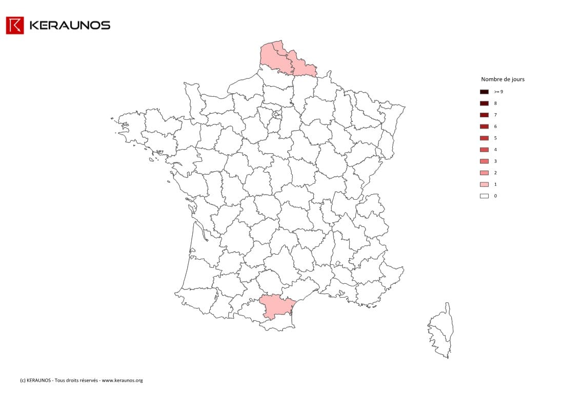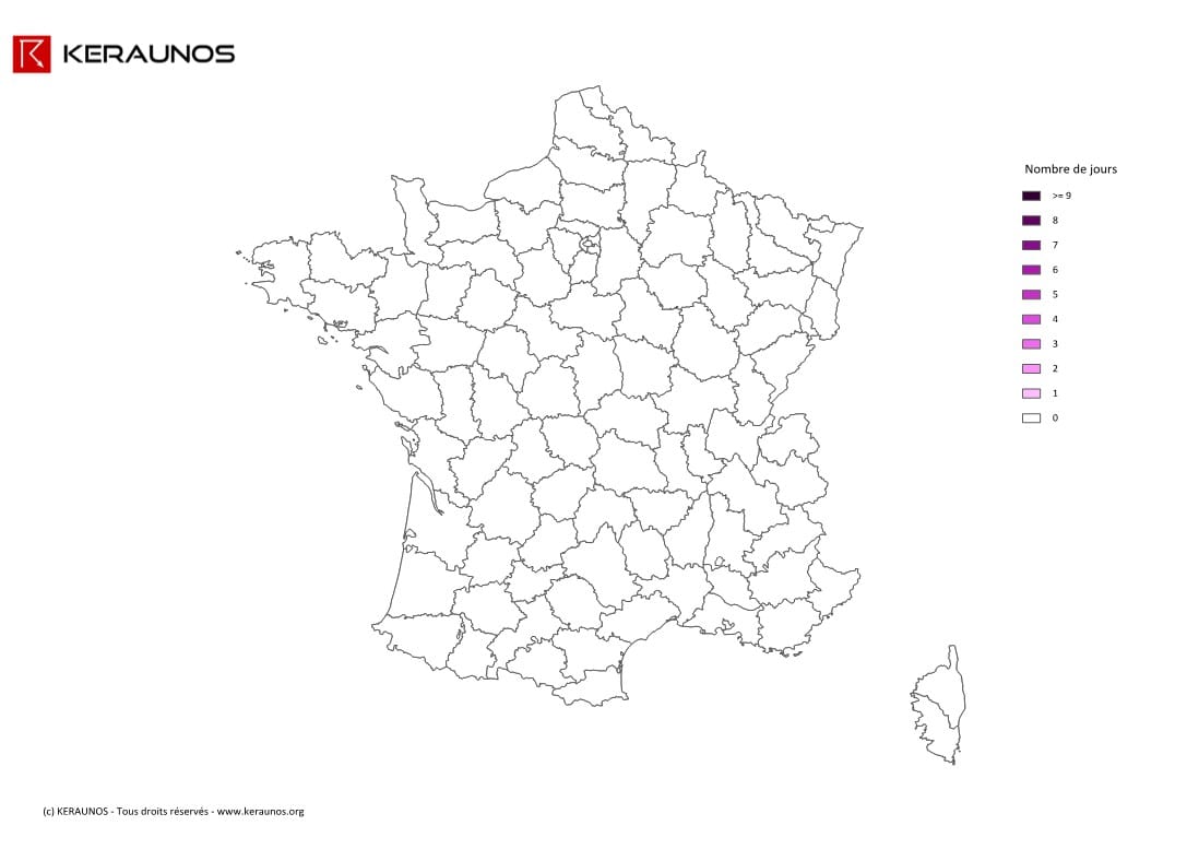 On dénombre 23 jours avec orage, dont 7 jours en première décade, 7 en deuxième décade et 9 en troisième décade.