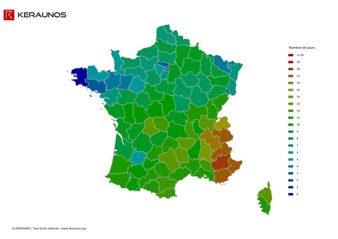 Les orages ont été nombreux sur l'ensemble du pays, sauf en Bretagne où ils sont typiquement moins fréquents. C'est sur les Alpes, jusqu'à l'est de la Provence que leur fréquence est la plus significative avec jusqu'à 18 jours d'orage sur les Alpes-de-Haute-Provence.