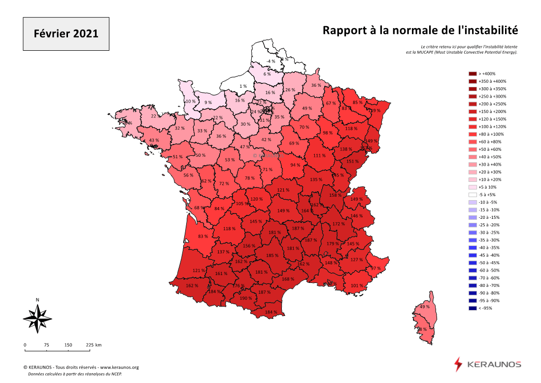 A échelle nationale, l'ISO* moyen mensuel ressort à 0,24 soit une valeur en nette baisse par rapport à février 2020. La journée la plus orageuse de ce mois est celle du 6 février, avec un ISO de 3,5.