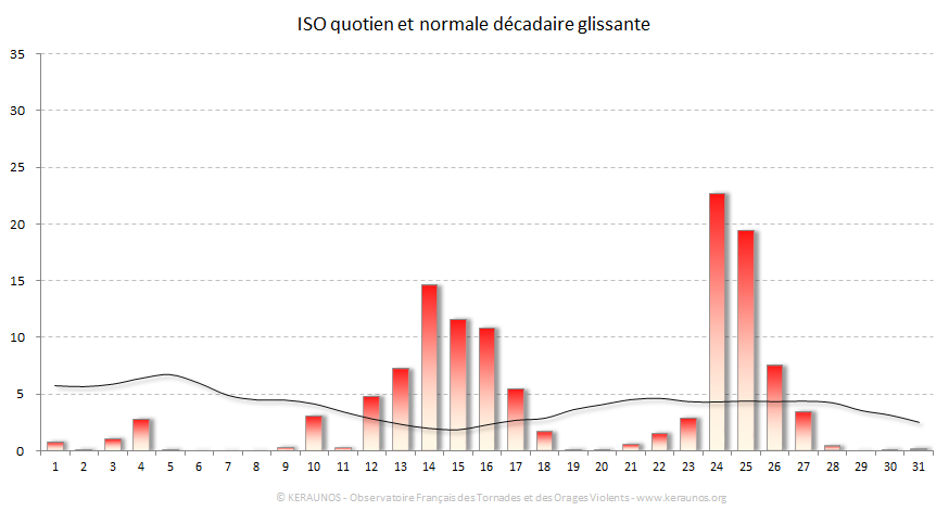 A échelle nationale, l'ISO* moyen mensuel ressort à 3,96 soit une valeur en baisse par rapport à août dernier. La journée la plus orageuse de ce mois est celle du 24 août, avec un ISO de 22,7.