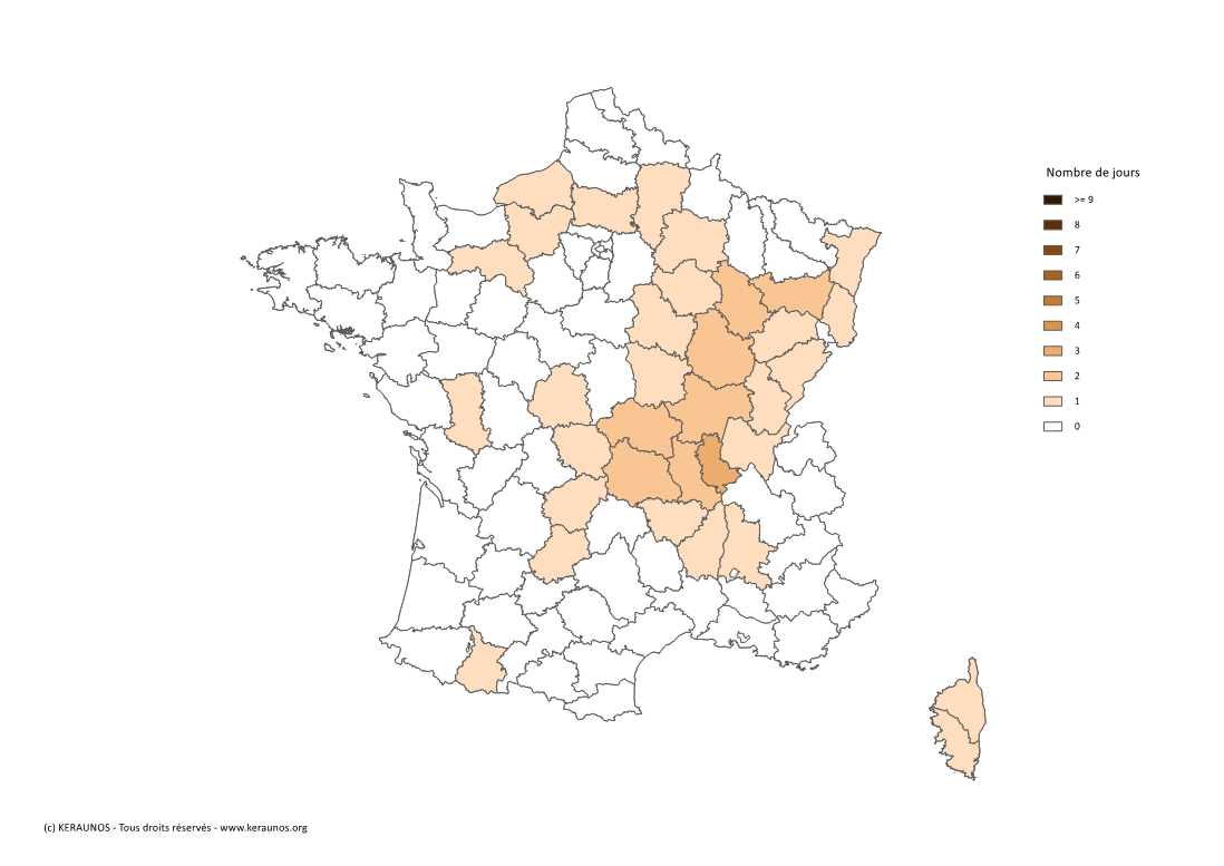 Mais en allant vers le nord-ouest, l'activité orageuse est restée assez réduite. On a relevé seulement 1 à 2 jours entre Paris et le Finistère, mais aussi dans les Bouches-du-Rhône et la Corse-du-Sud et 2 à 3 jours près de la Manche ou de la Méditerranée.