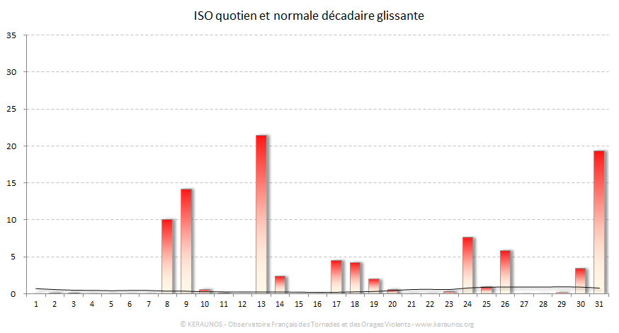 A échelle nationale, l'ISO* moyen mensuel ressort à 3,13 soit une valeur en nette hausse par rapport à mars 2022. La journée la plus orageuse de ce mois est celle du 13 mars, avec un ISO record de 21,4.