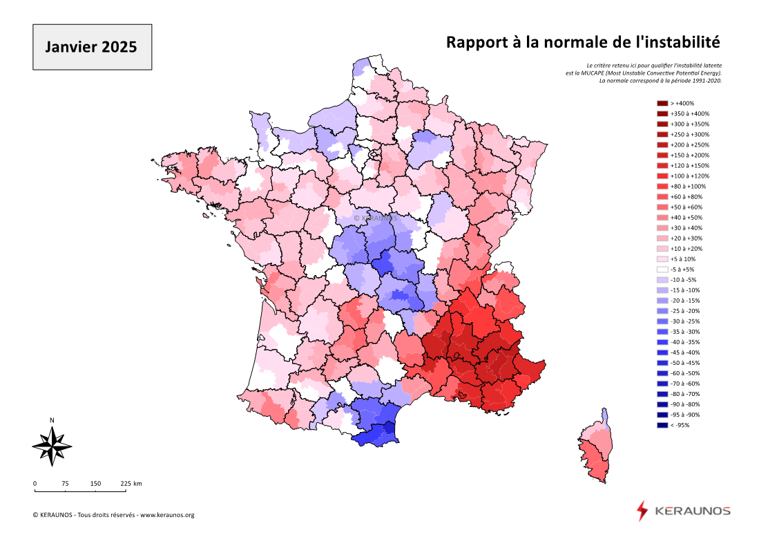 A échelle nationale, l'ISO* moyen mensuel ressort à 0,68 soit une valeur en nette hausse par rapport à janvier 2024. La journée la plus orageuse de ce mois est celle du 27 janvier, avec un ISO de 10.