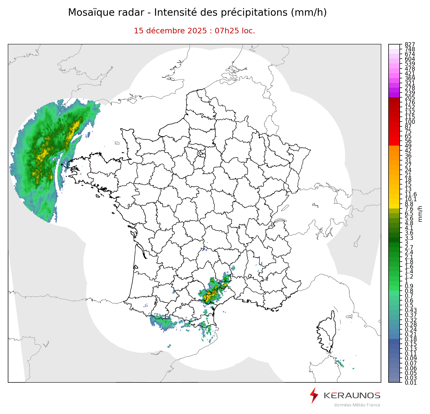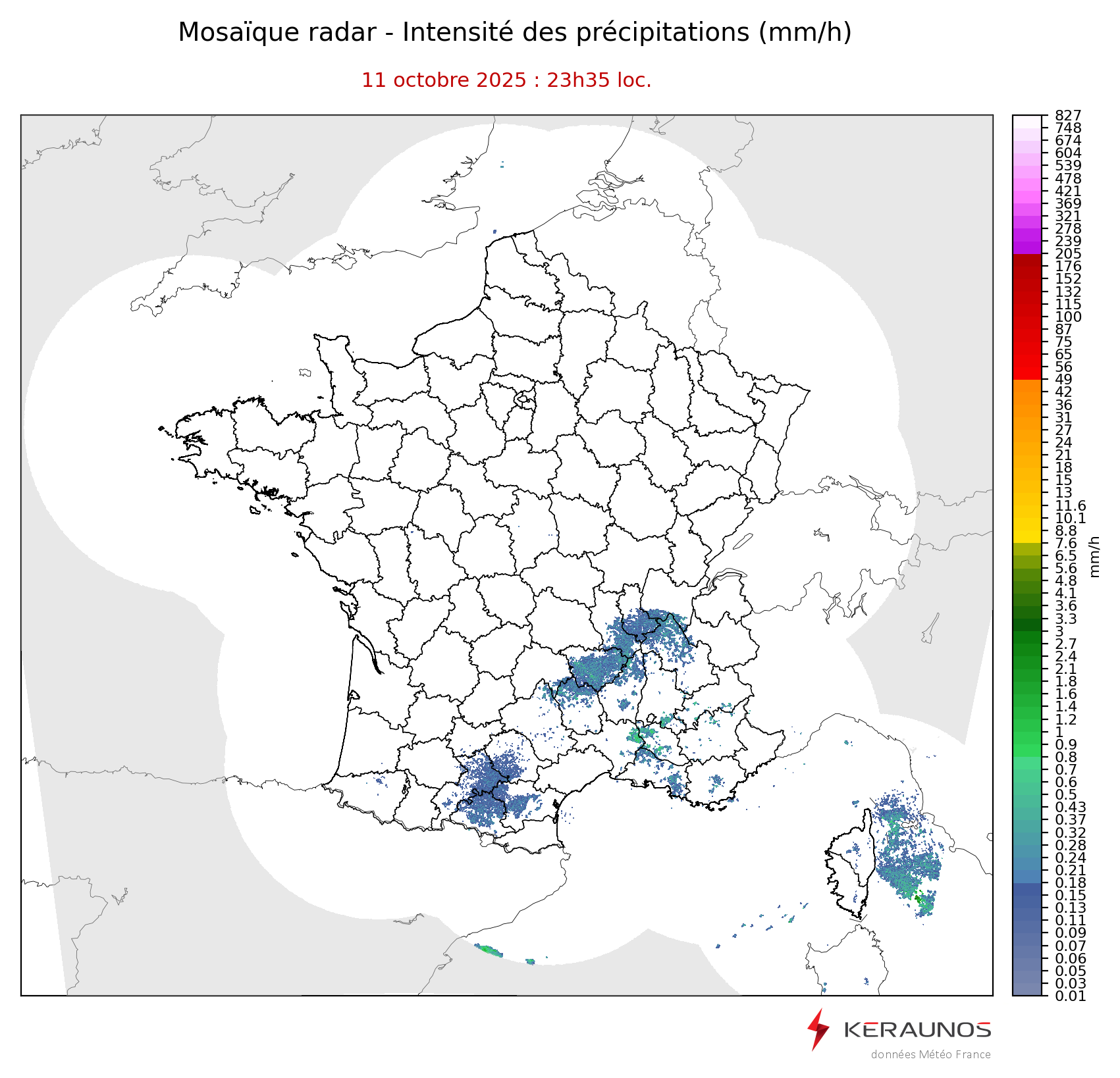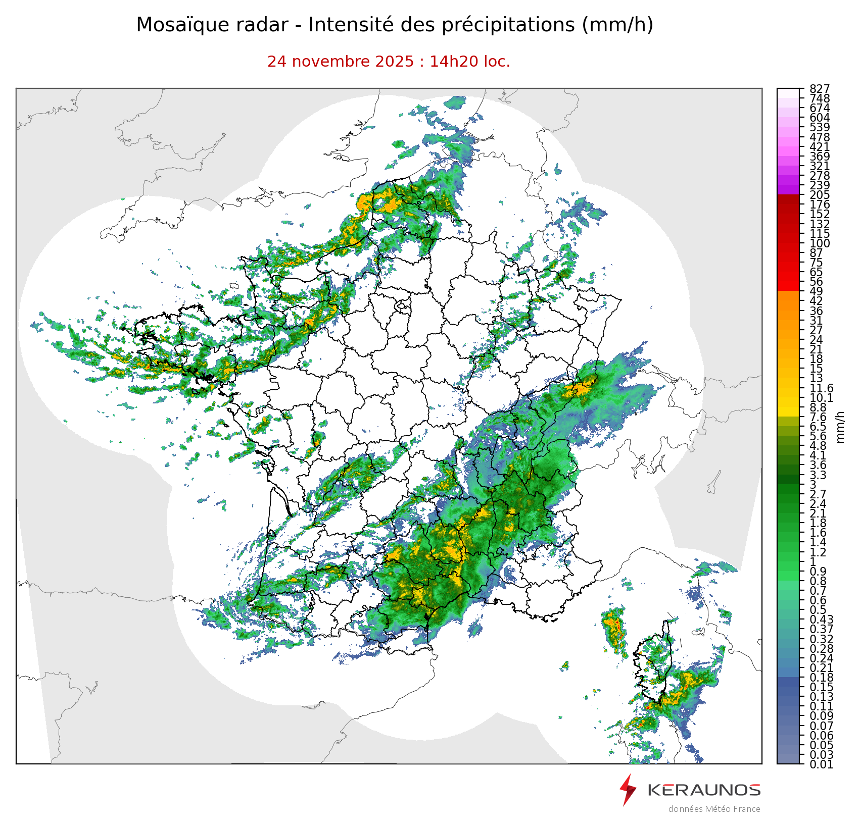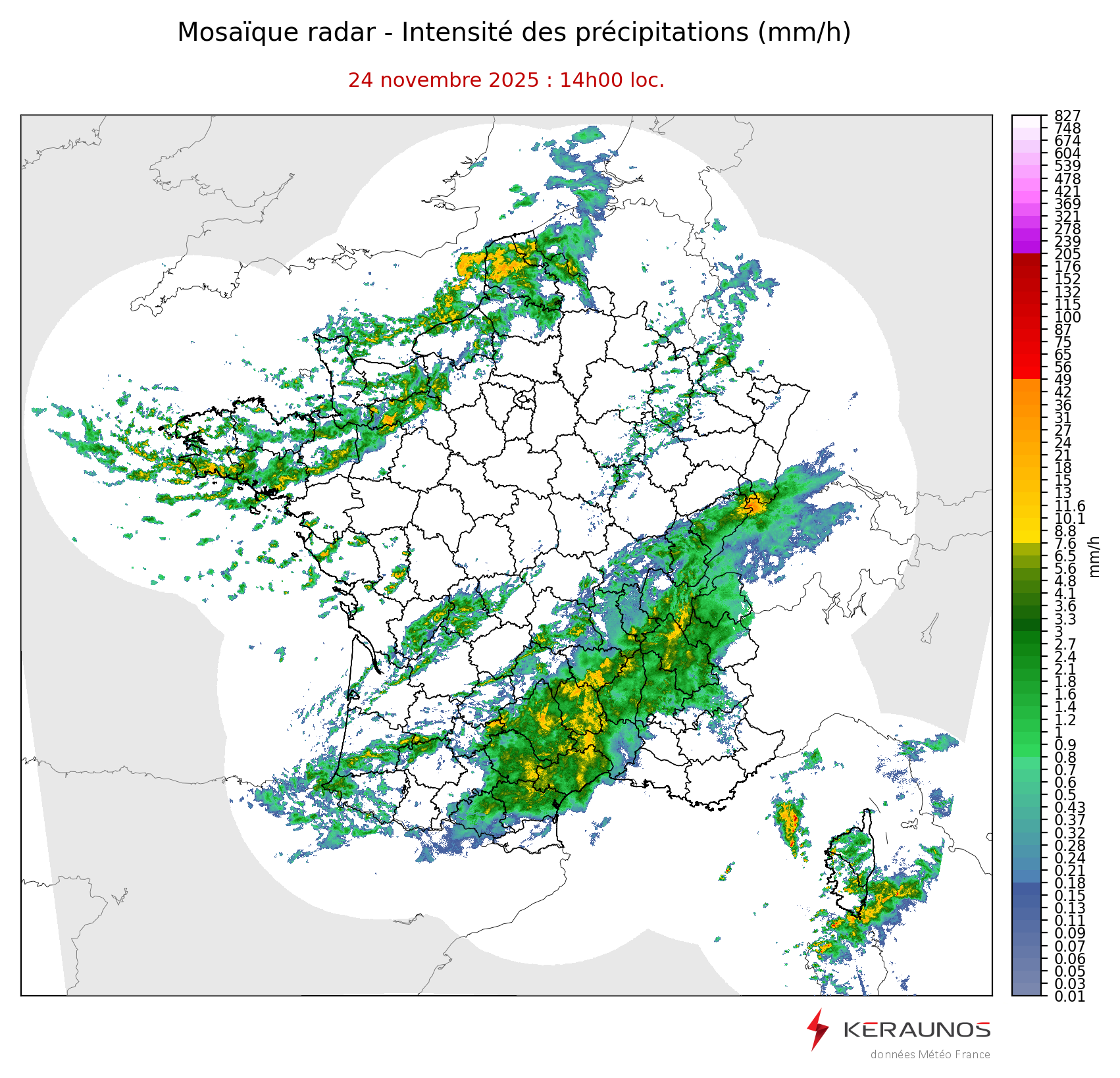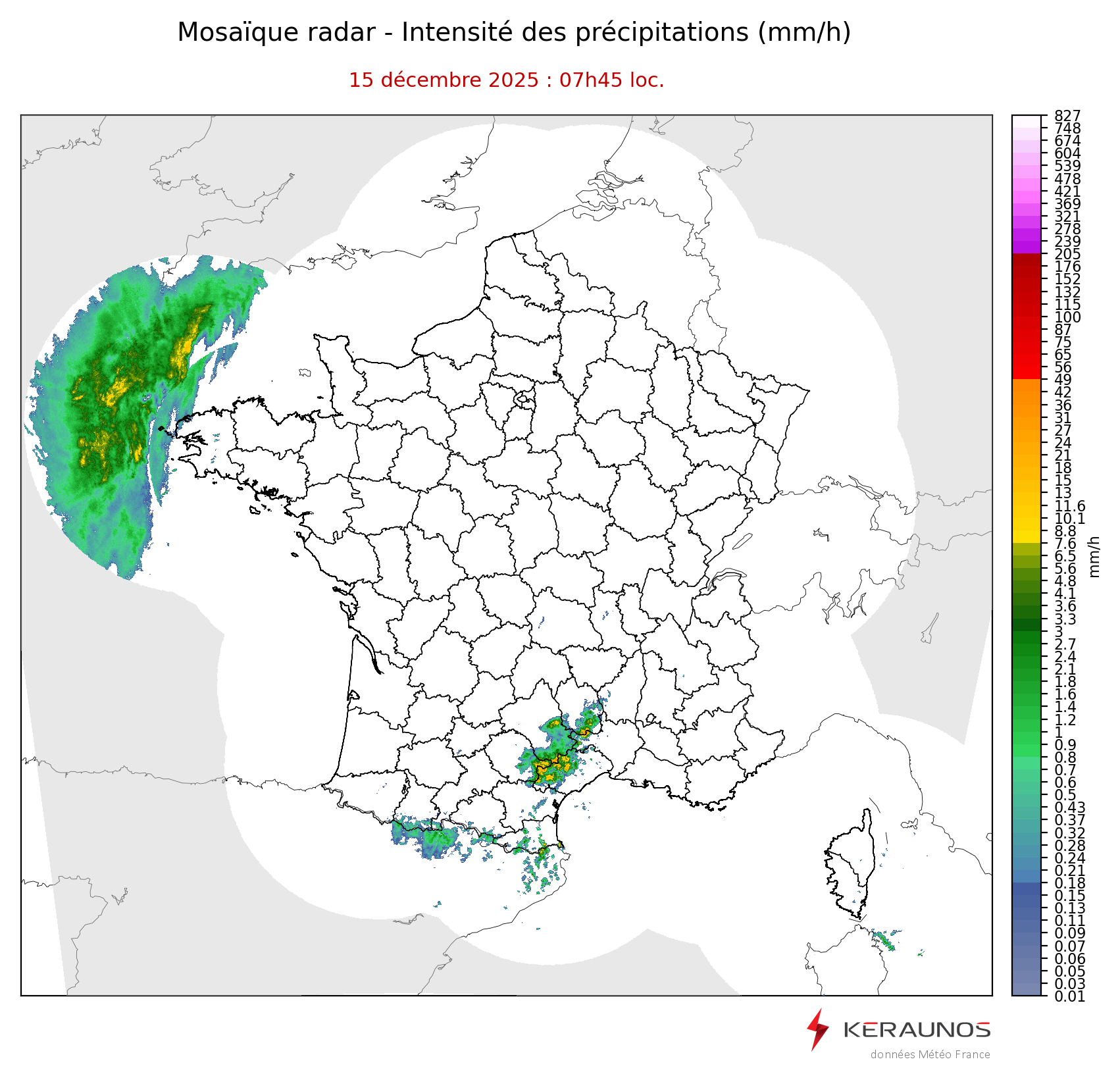 Mosaïque radar France Mosaïque lame d'eau Radars individuels Doppler Radar Europe 15 min Les mosaïques « radar France 5 minutes » fusionnent l’ensemble des données radars pour localiser précisément les précipitations sur la France. France entière Nord-Ouest Nord-Est Sud-Est Sud-Ouest Dernière heure 2 dernières heures 3 dernières heures 4 dernières heures 5 dernières heures 6 dernières heures Img préc. Play Img suiv. Générer GIF