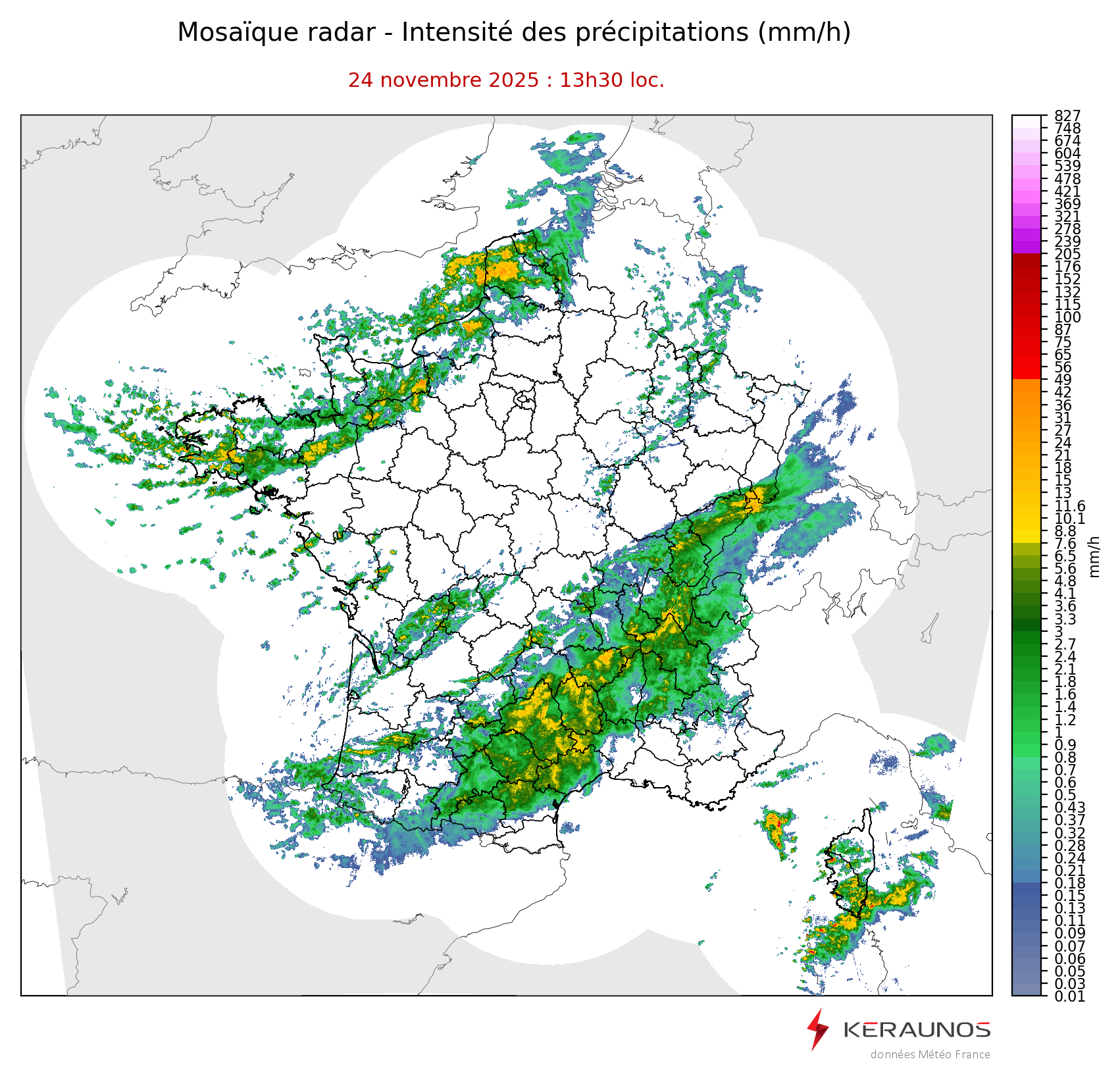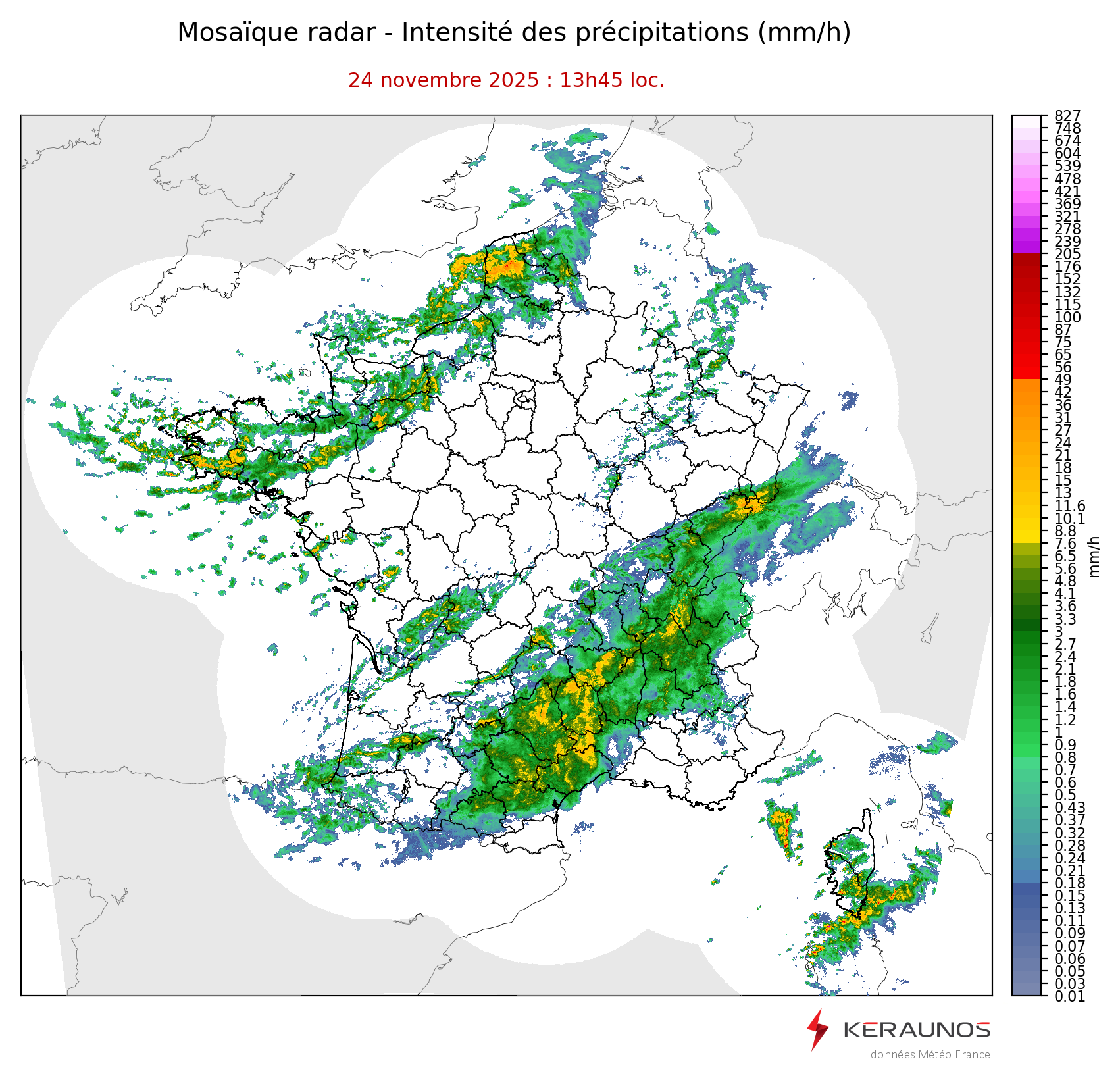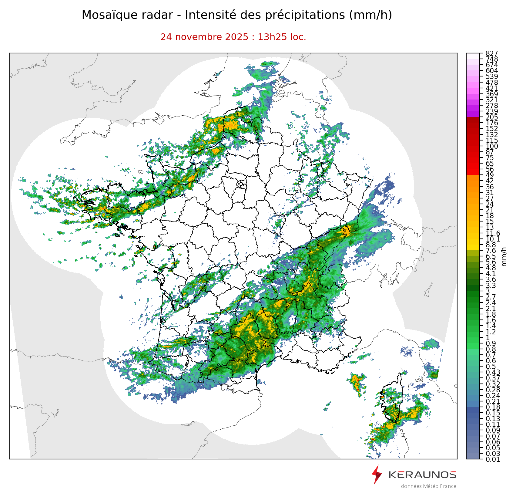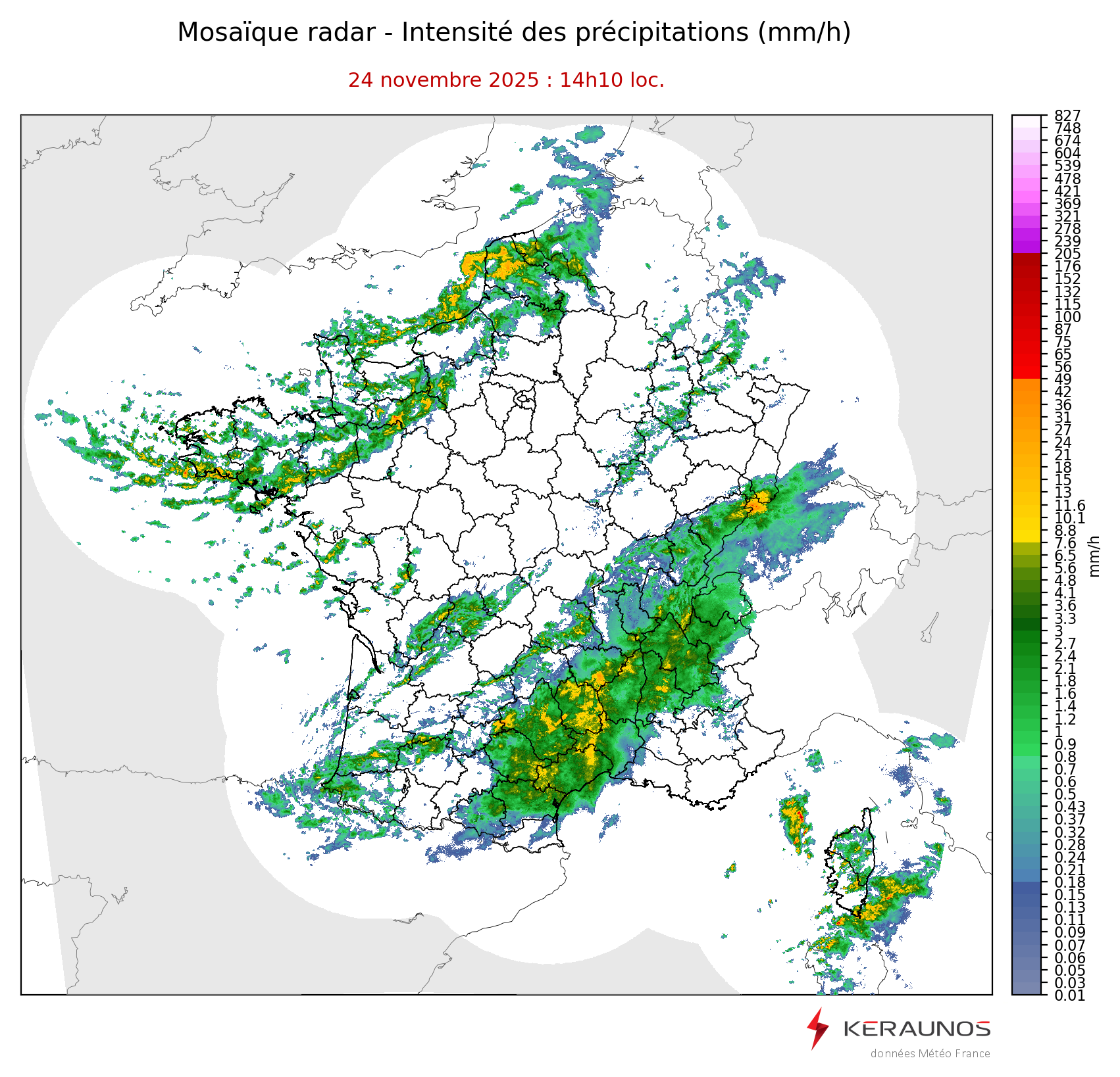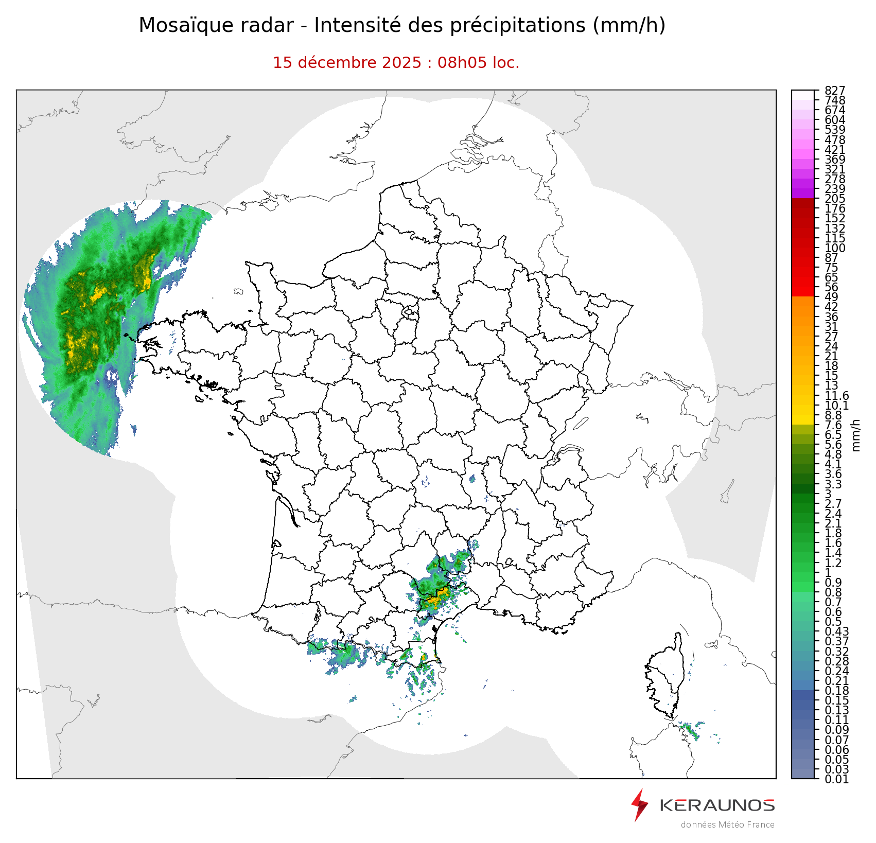Mosaïque radar France Mosaïque lame d'eau Radars individuels Doppler Radar Europe 15 min Les mosaïques « radar France 5 minutes » fusionnent l’ensemble des données radars pour localiser précisément les précipitations sur la France. France entière Nord-Ouest Nord-Est Sud-Est Sud-Ouest Dernière heure 2 dernières heures 3 dernières heures 4 dernières heures 5 dernières heures 6 dernières heures Img préc. Play Img suiv. Générer GIF