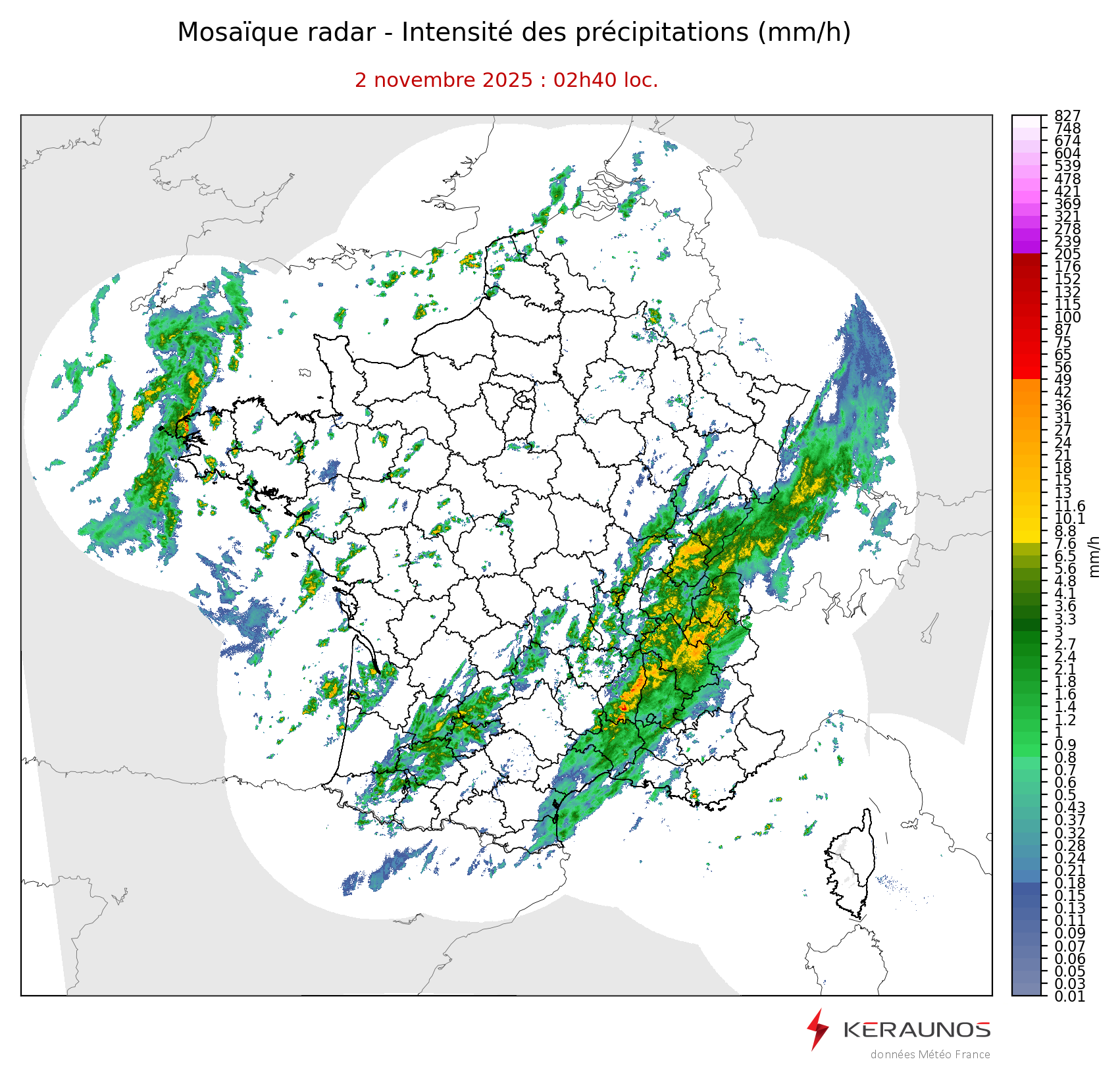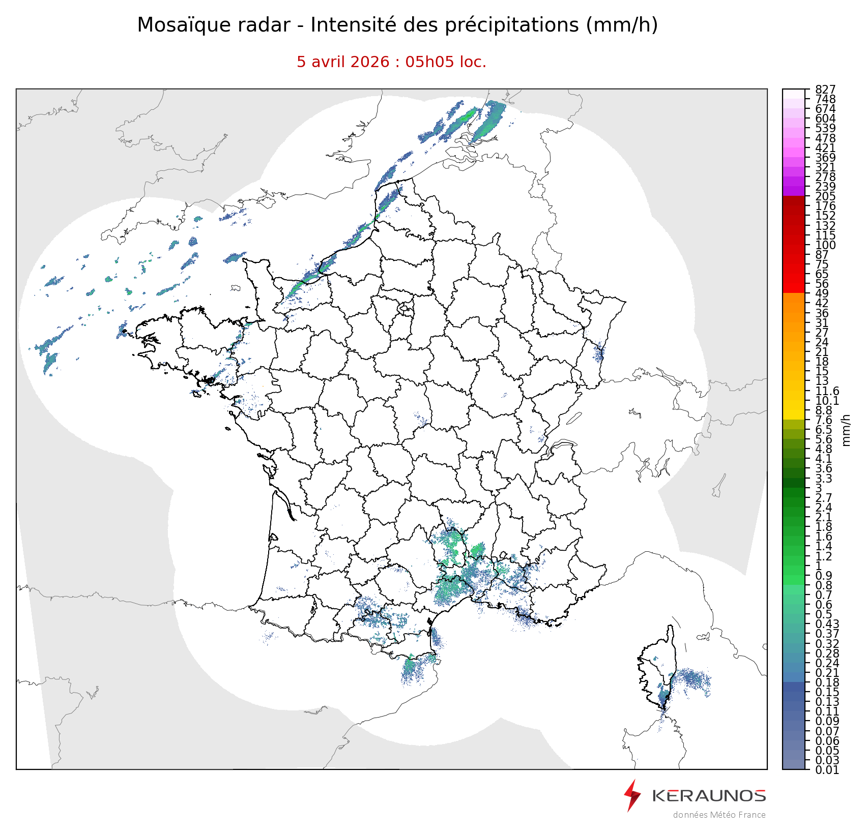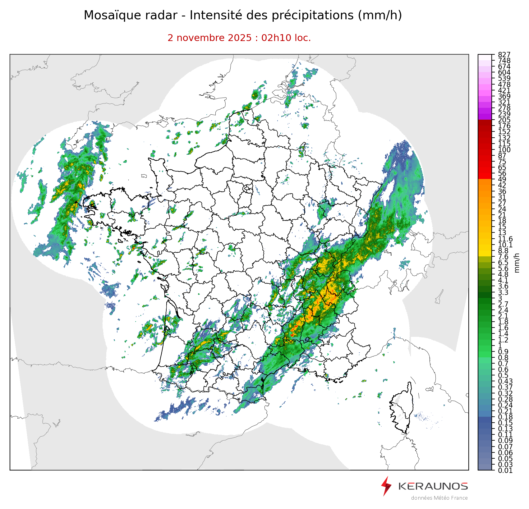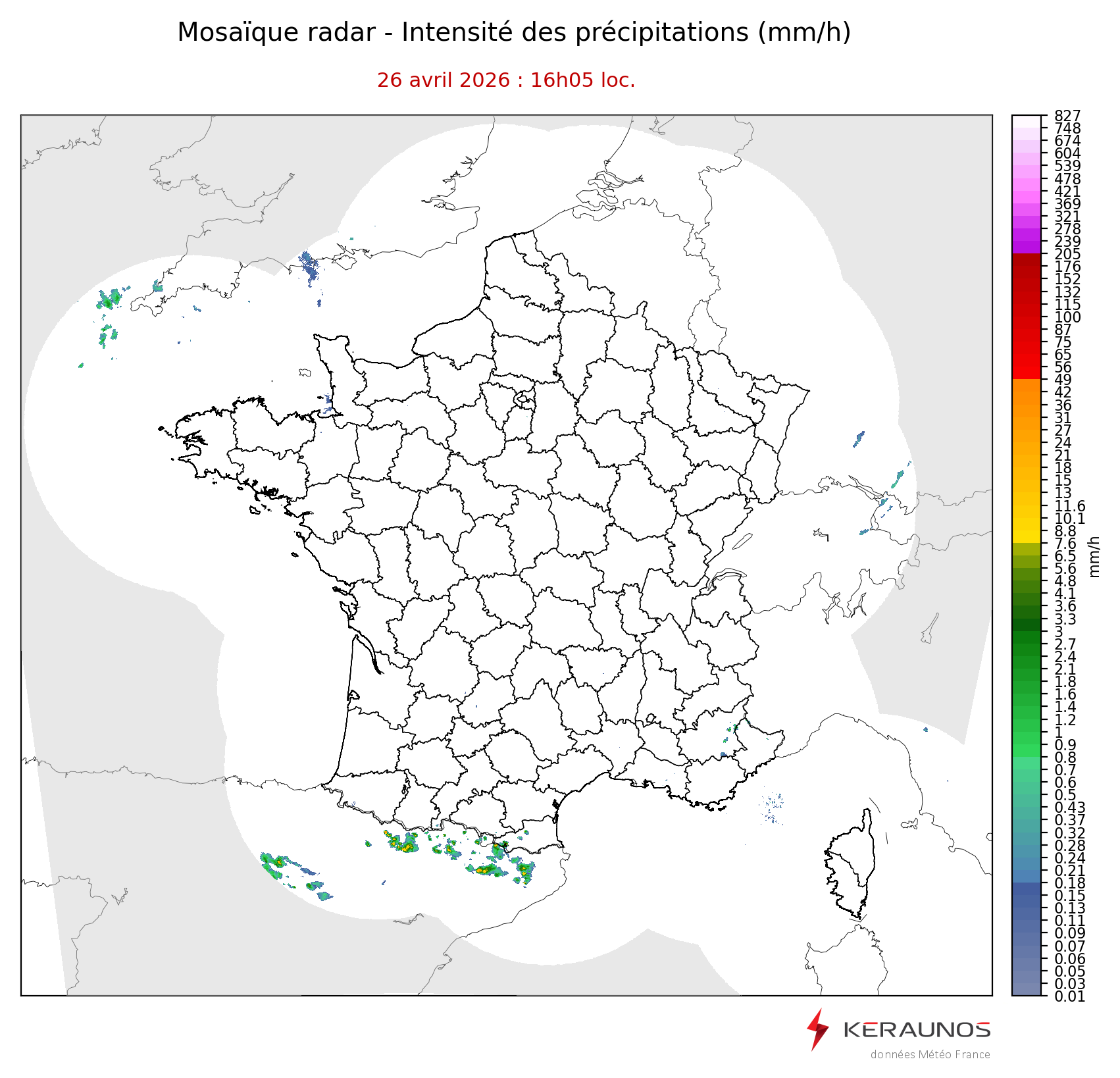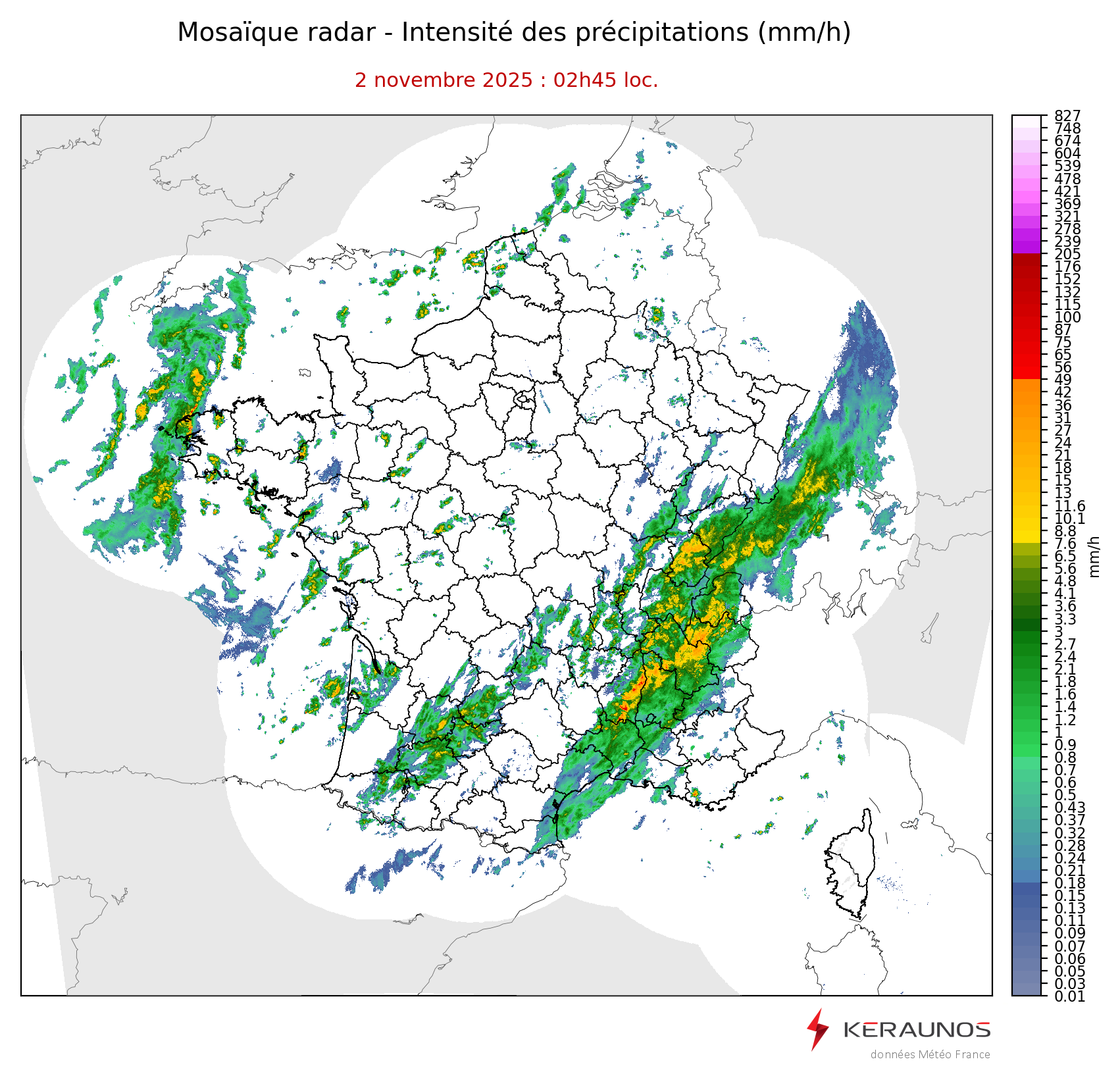 Mosaïque radar France Mosaïque lame d'eau Radars individuels Doppler Radar Europe 15 min Les mosaïques « radar France 5 minutes » fusionnent l’ensemble des données radars pour localiser précisément les précipitations sur la France. France entière Nord-Ouest Nord-Est Sud-Est Sud-Ouest Dernière heure 2 dernières heures 3 dernières heures 4 dernières heures 5 dernières heures 6 dernières heures Img préc. Play Img suiv. Générer GIF