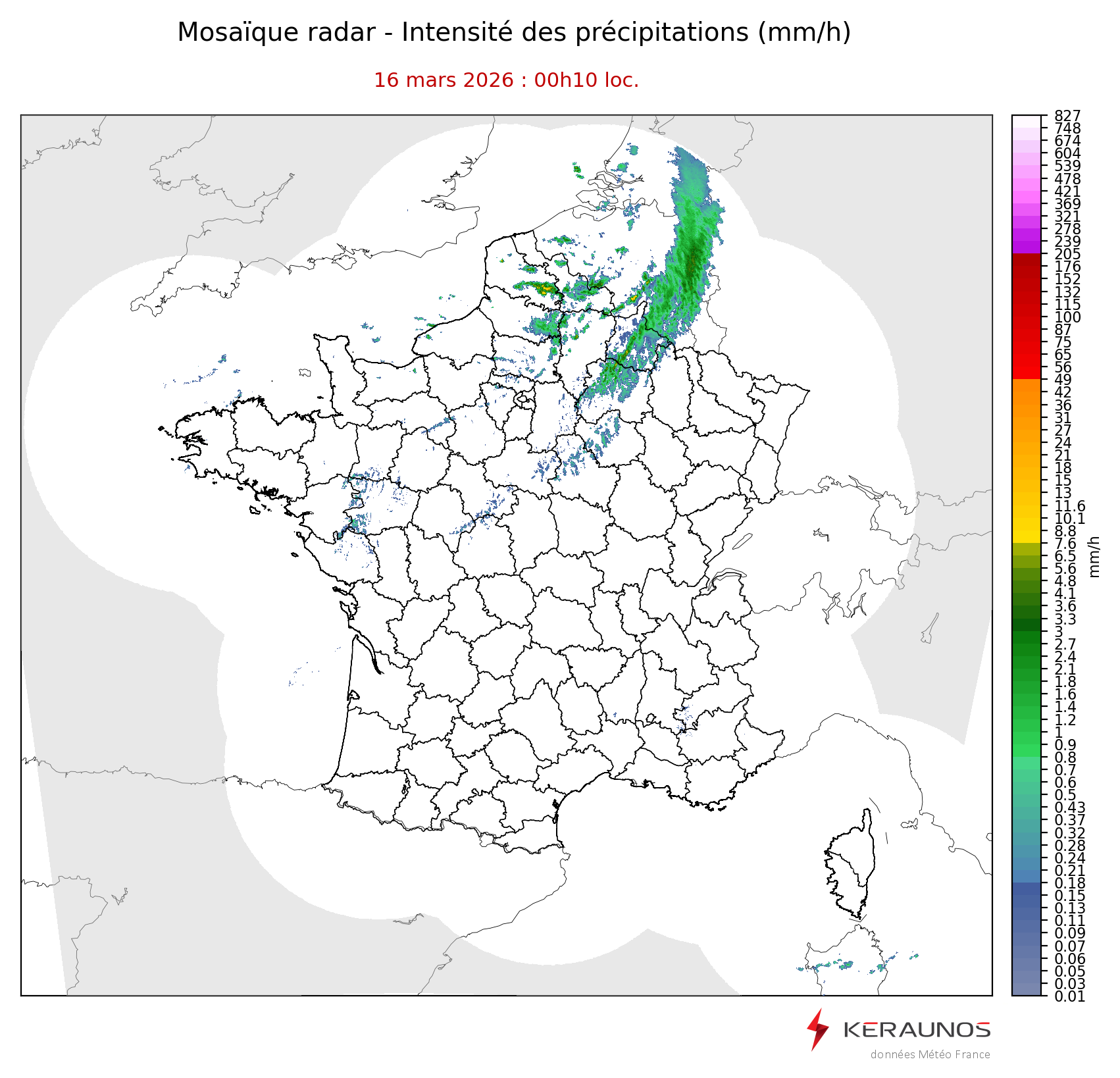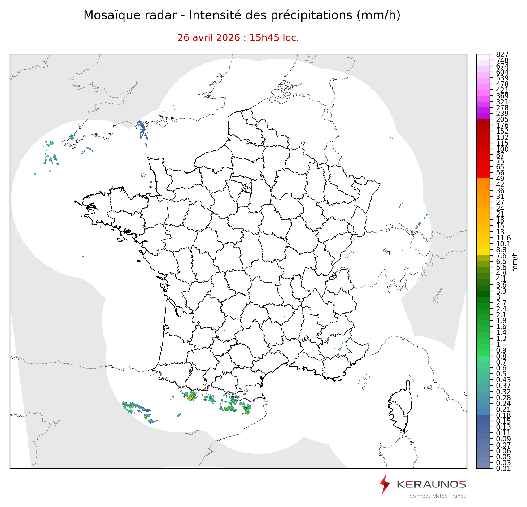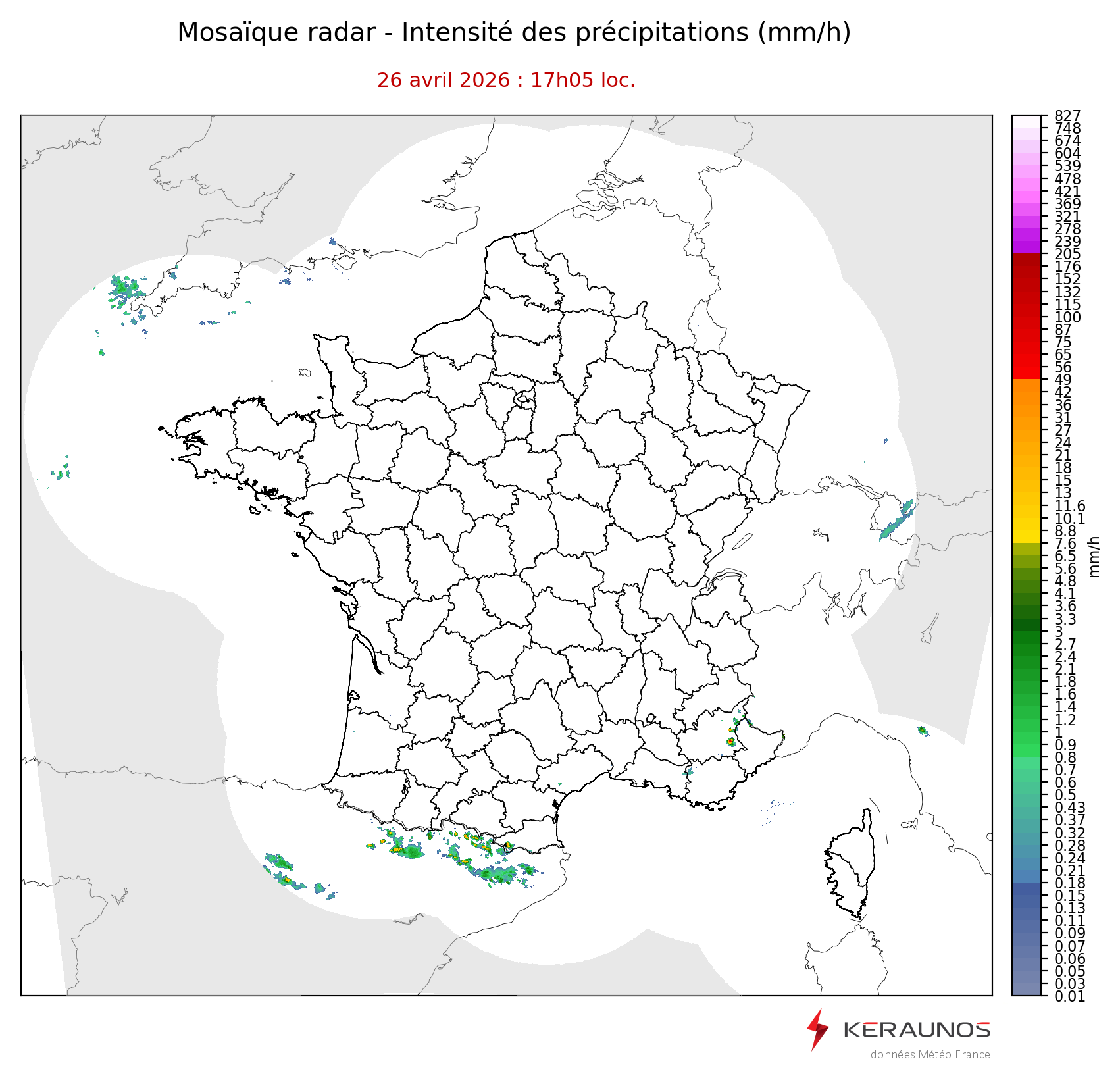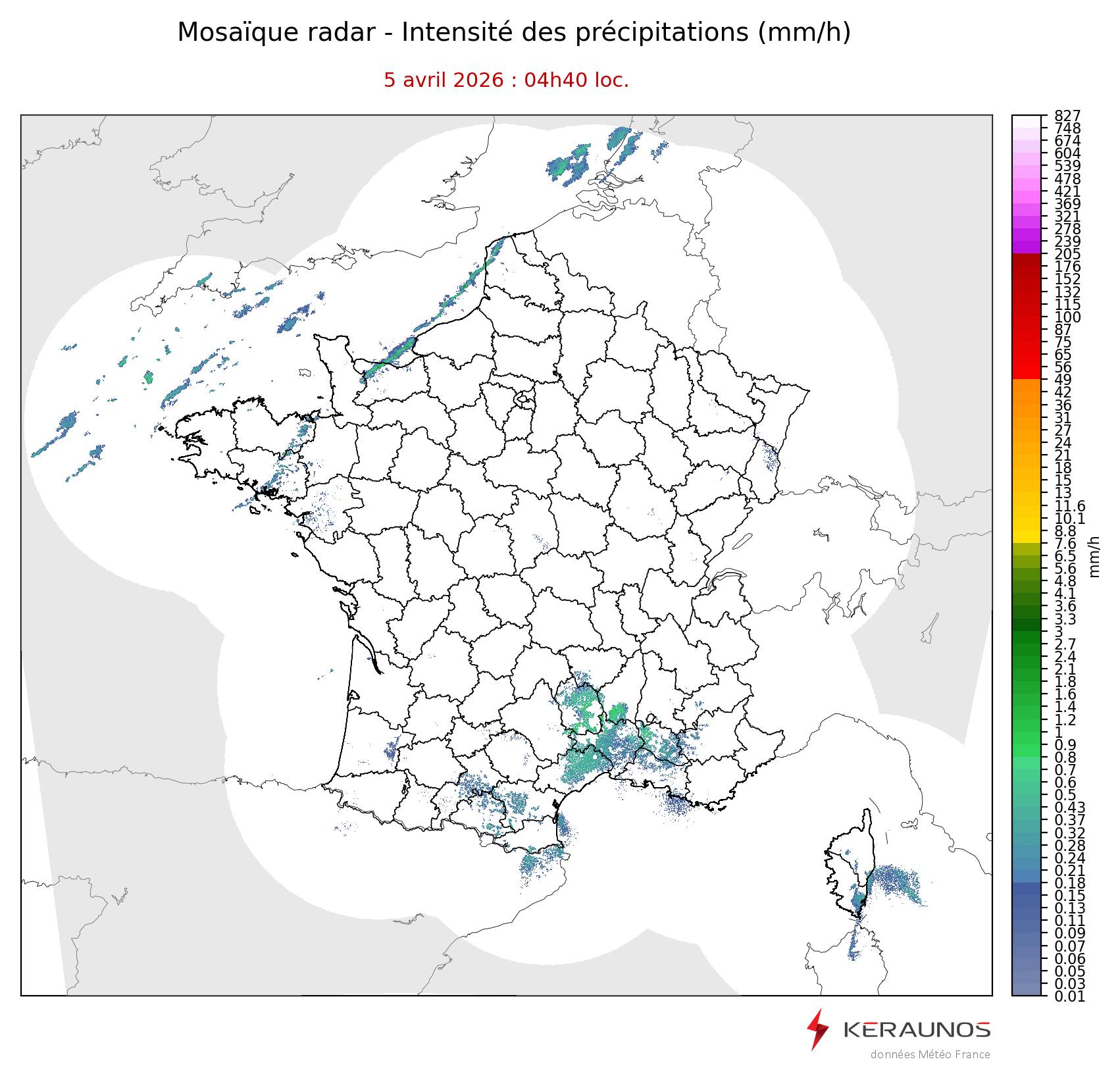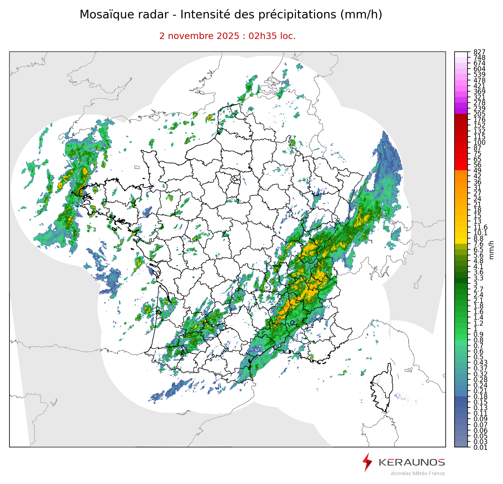 Mosaïque radar France Mosaïque lame d'eau Radars individuels Doppler Radar Europe 15 min Les mosaïques « radar France 5 minutes » fusionnent l’ensemble des données radars pour localiser précisément les précipitations sur la France. France entière Nord-Ouest Nord-Est Sud-Est Sud-Ouest Dernière heure 2 dernières heures 3 dernières heures 4 dernières heures 5 dernières heures 6 dernières heures Img préc. Play Img suiv. Générer GIF