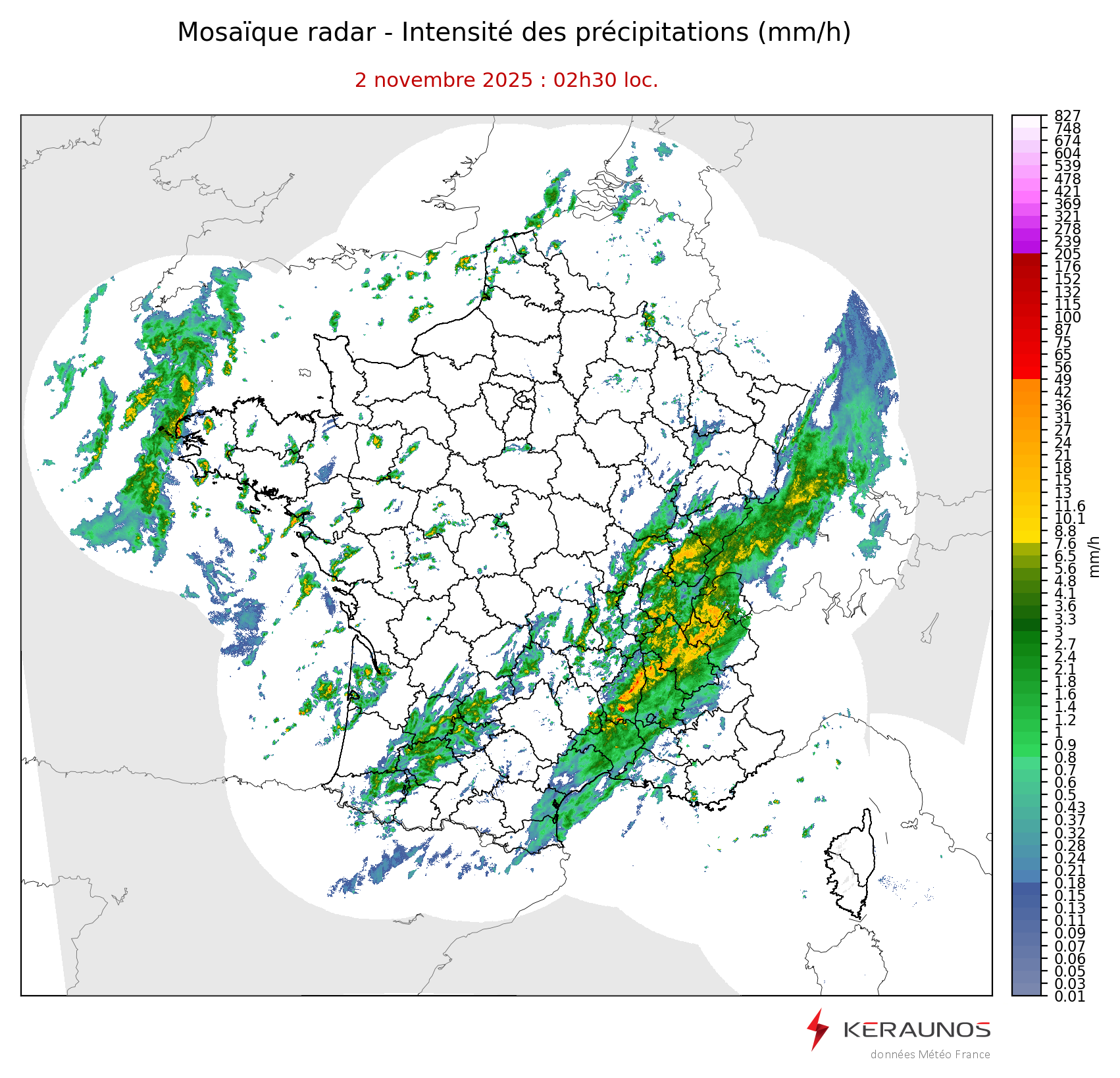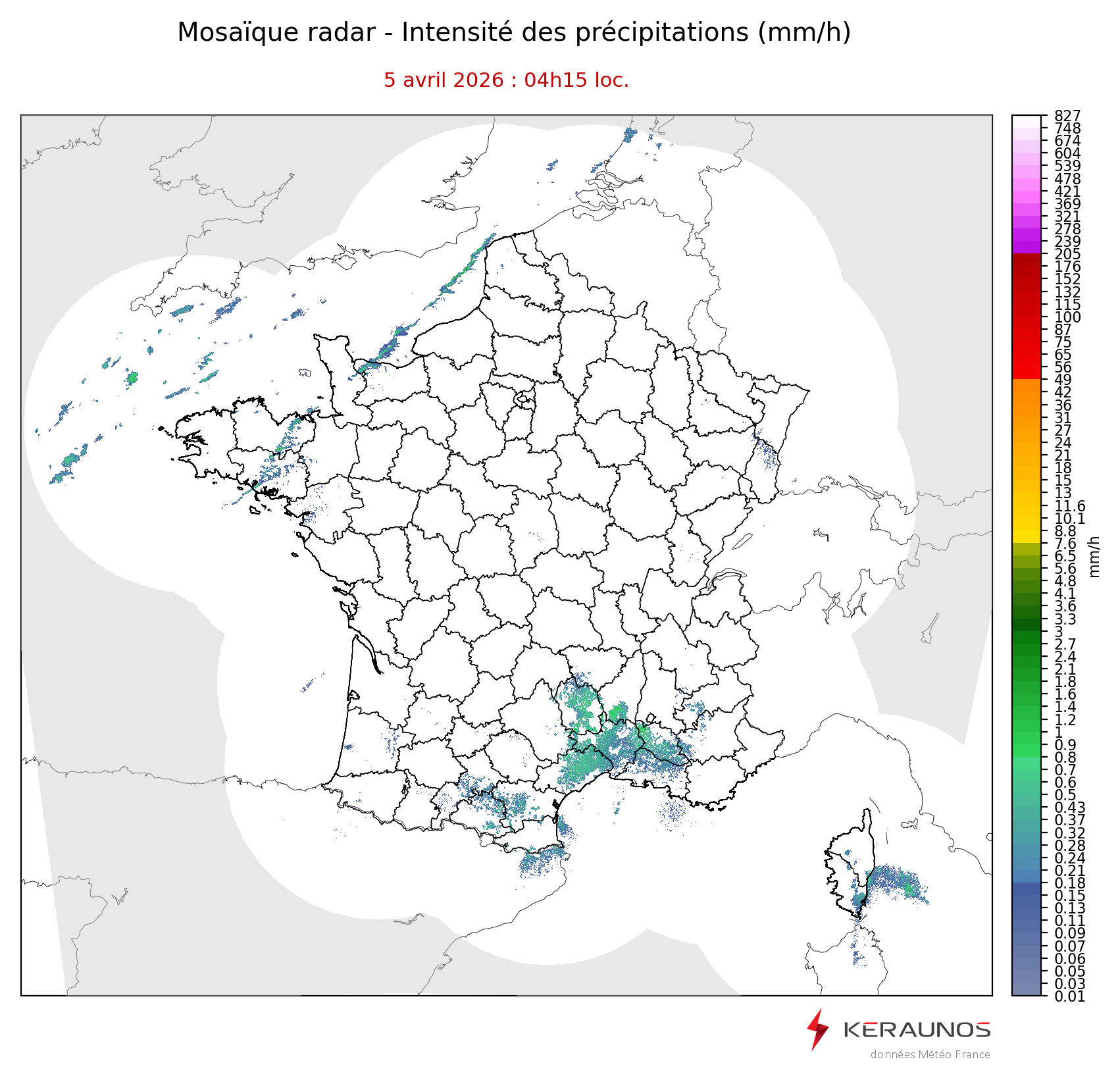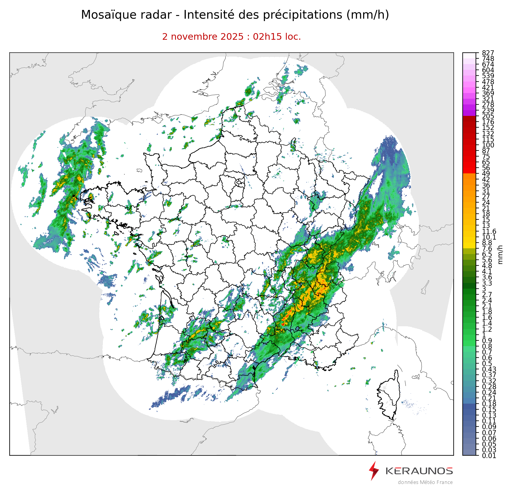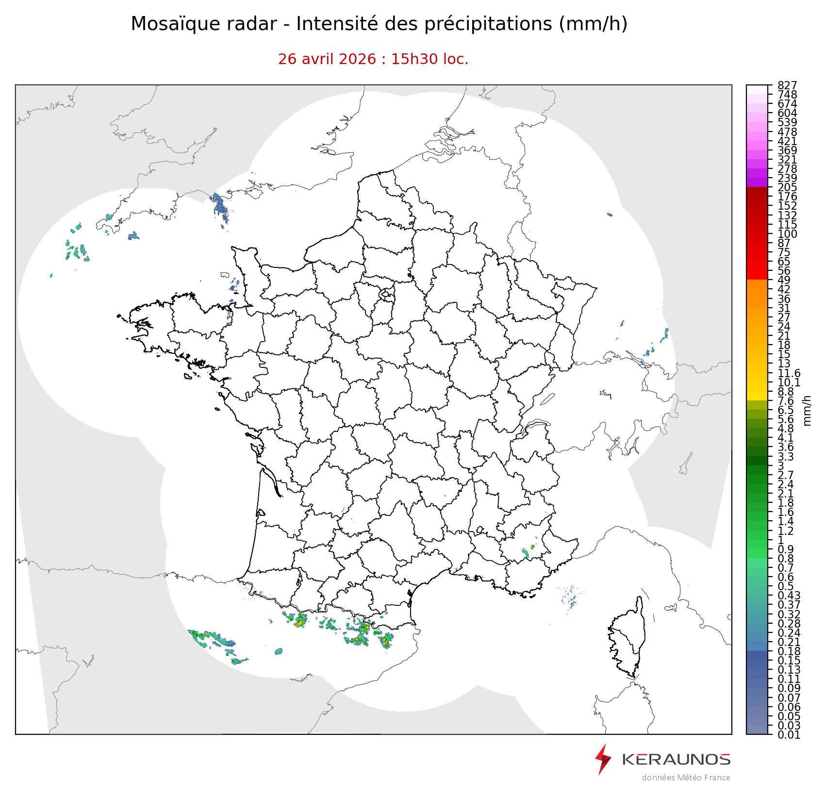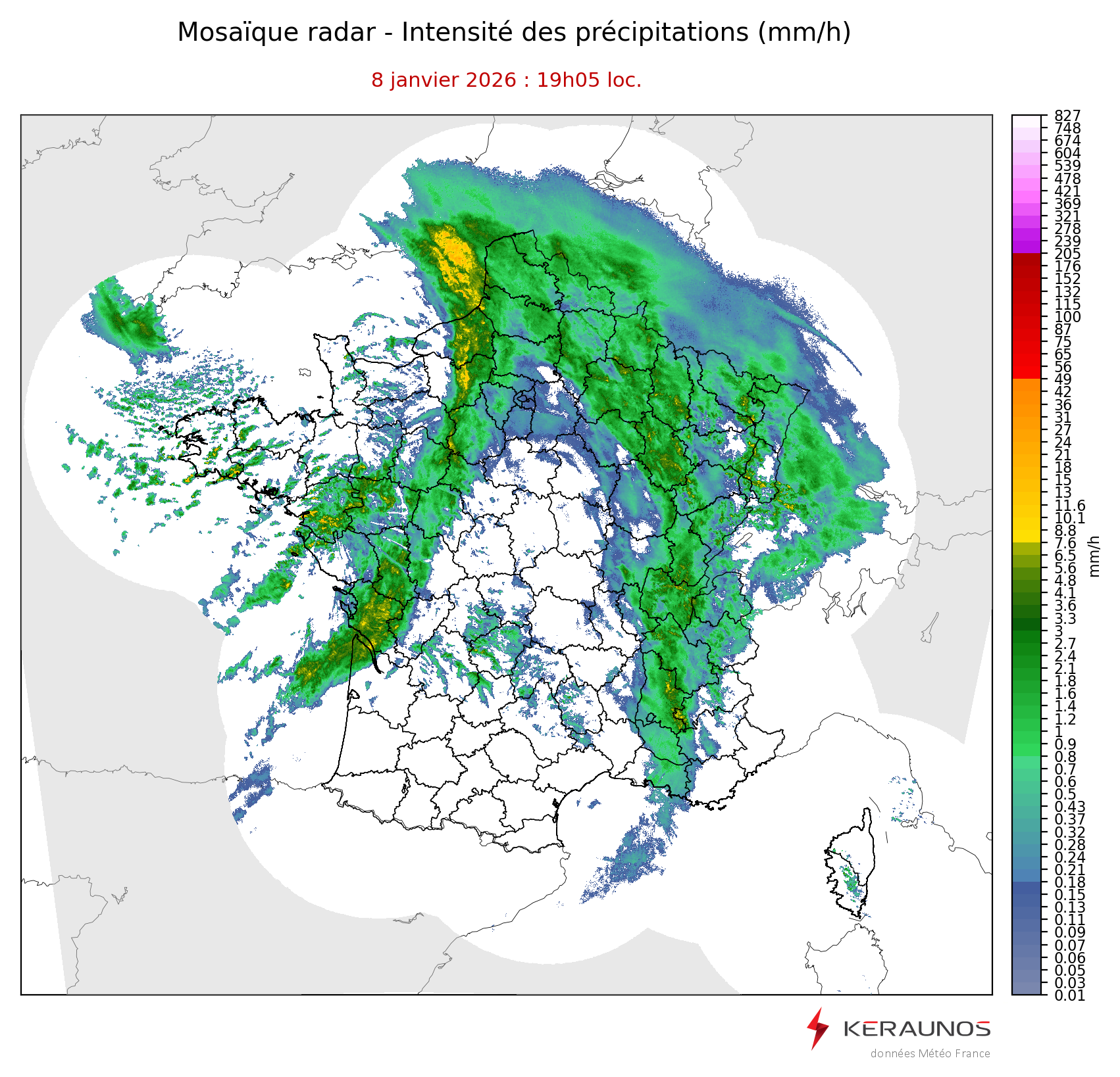 Mosaïque radar France Mosaïque lame d'eau Radars individuels Doppler Radar Europe 15 min Les mosaïques « radar France 5 minutes » fusionnent l’ensemble des données radars pour localiser précisément les précipitations sur la France. France entière Nord-Ouest Nord-Est Sud-Est Sud-Ouest Dernière heure 2 dernières heures 3 dernières heures 4 dernières heures 5 dernières heures 6 dernières heures Img préc. Play Img suiv. Générer GIF