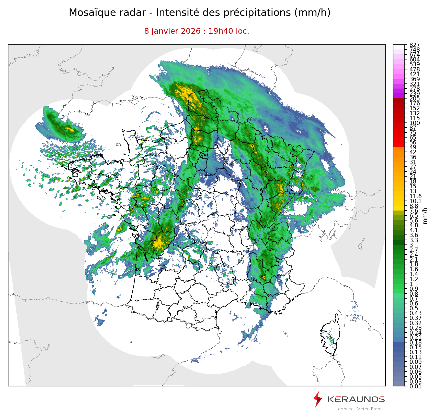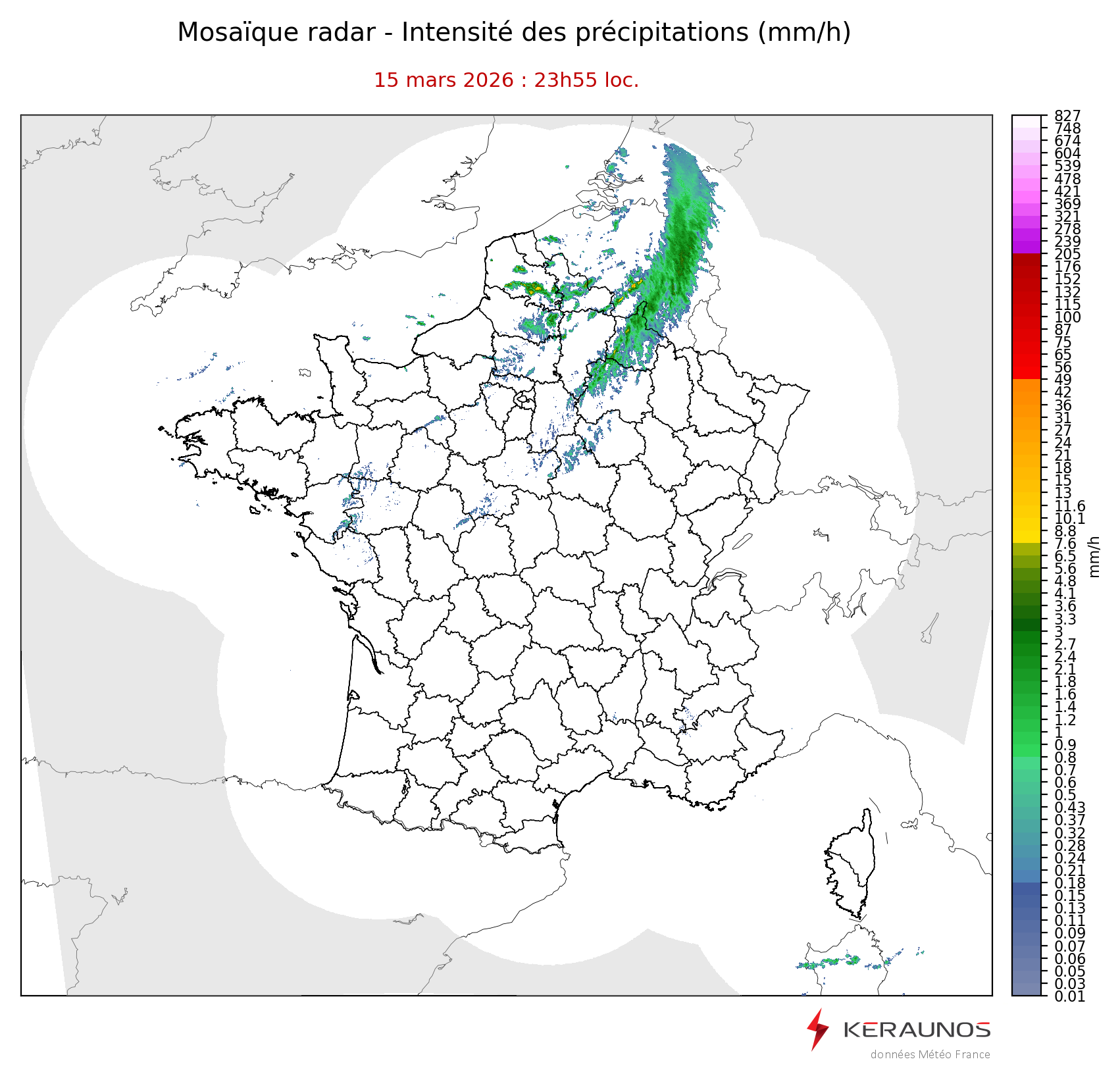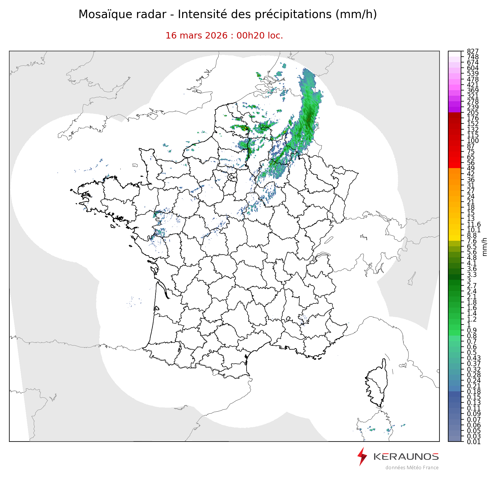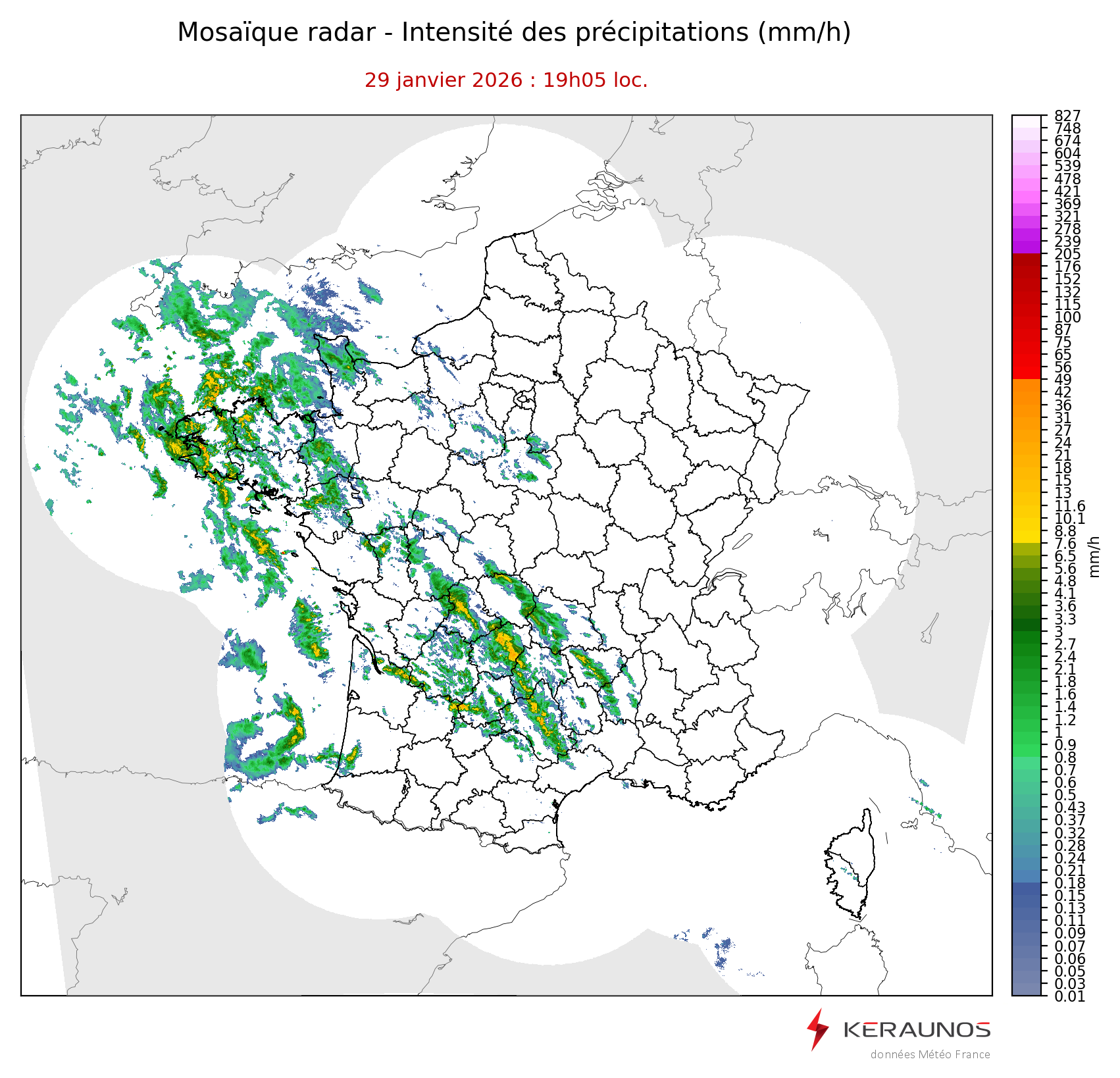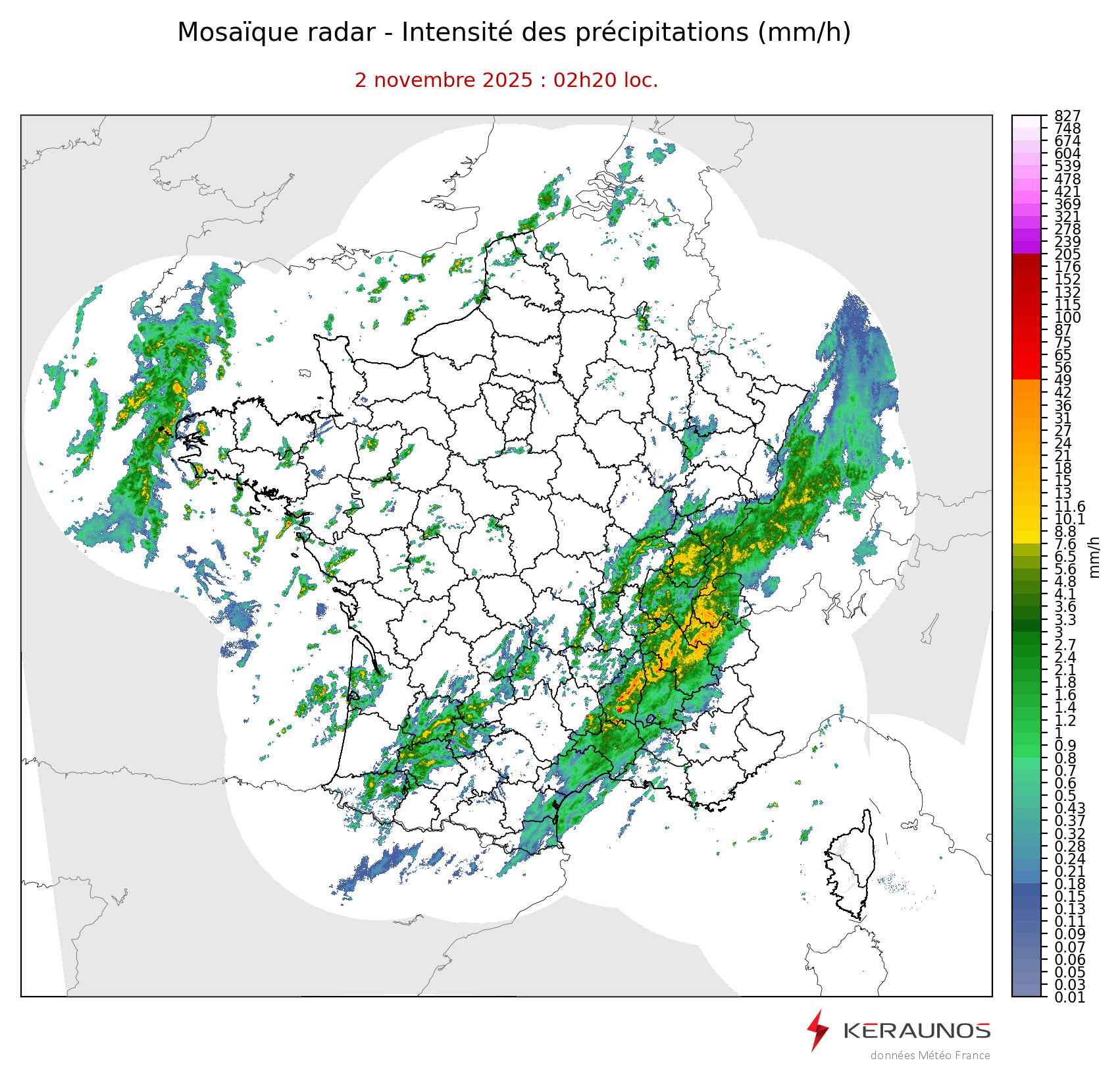 Mosaïque radar France Mosaïque lame d'eau Radars individuels Doppler Radar Europe 15 min Les mosaïques « radar France 5 minutes » fusionnent l’ensemble des données radars pour localiser précisément les précipitations sur la France. France entière Nord-Ouest Nord-Est Sud-Est Sud-Ouest Dernière heure 2 dernières heures 3 dernières heures 4 dernières heures 5 dernières heures 6 dernières heures Img préc. Play Img suiv. Générer GIF