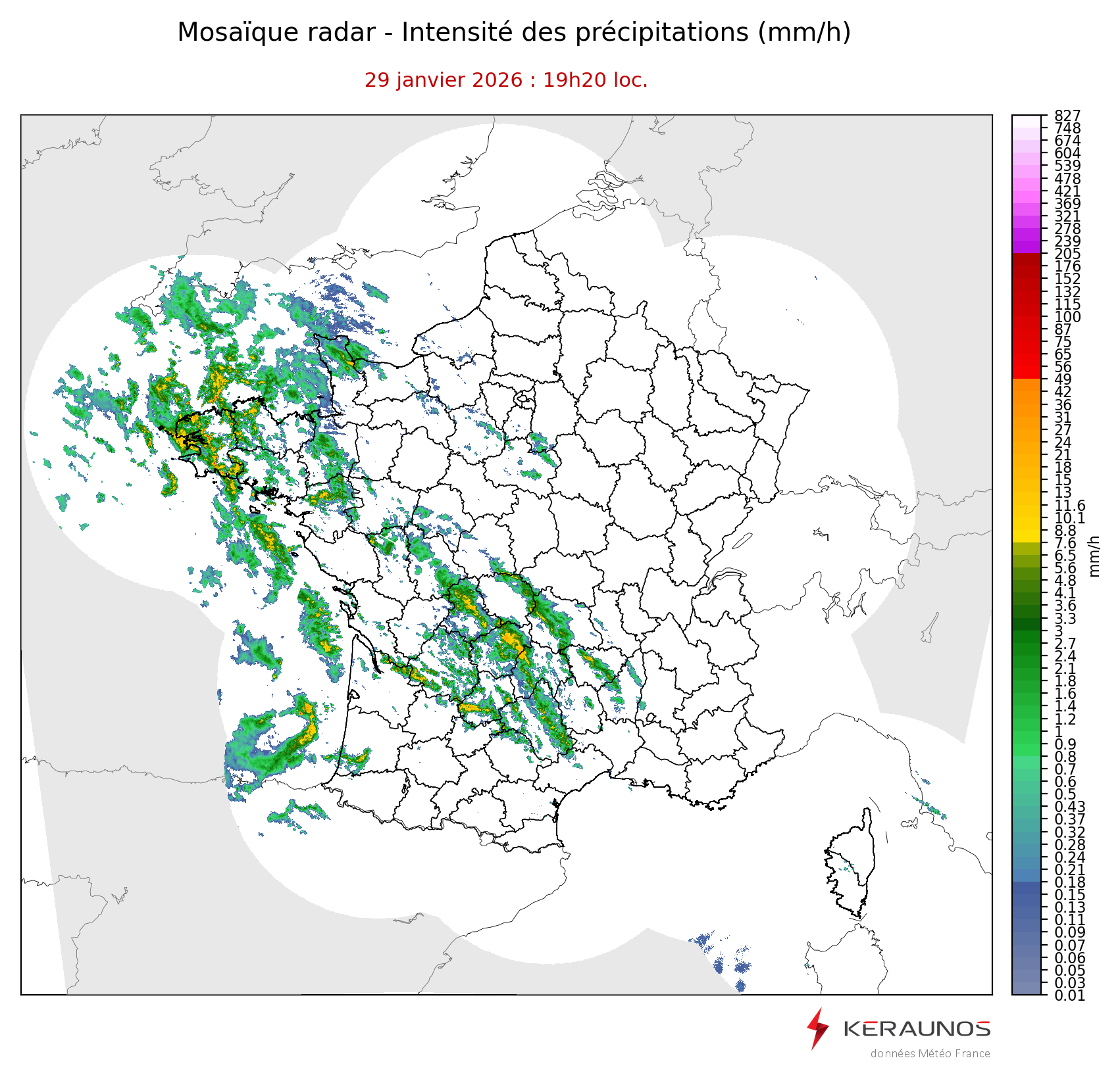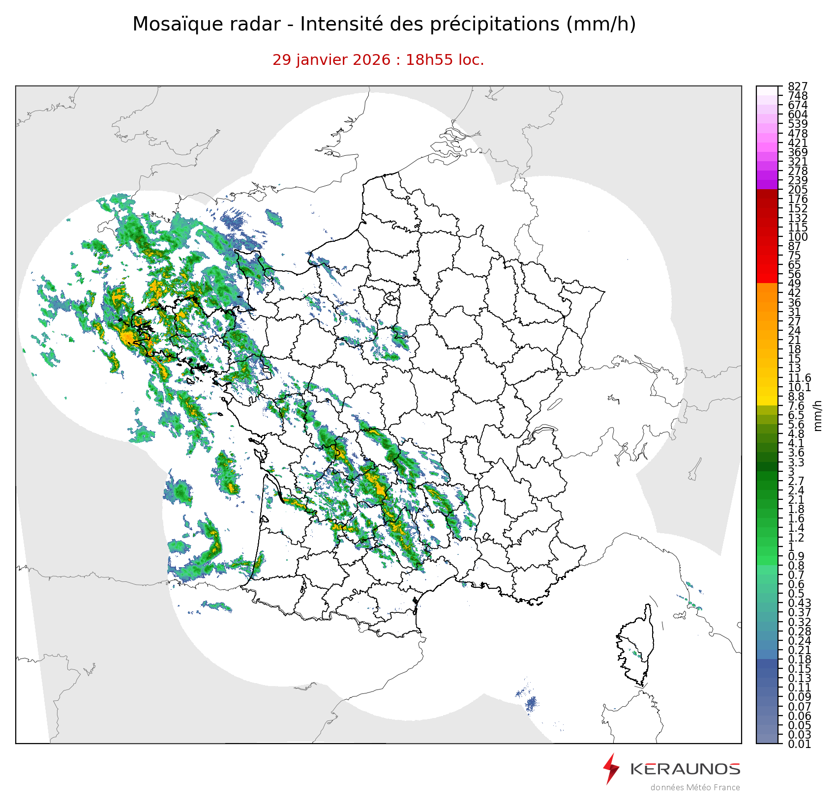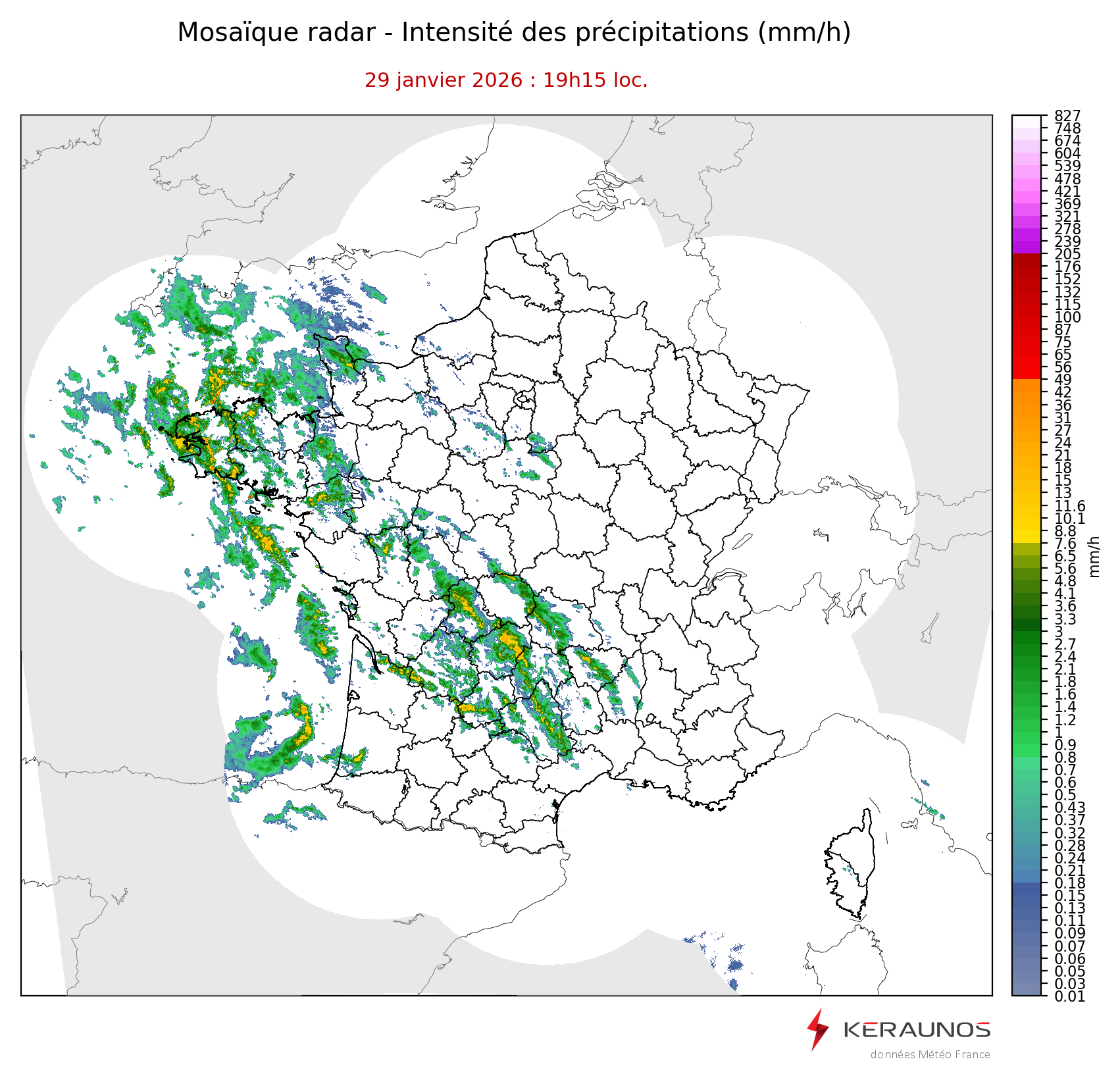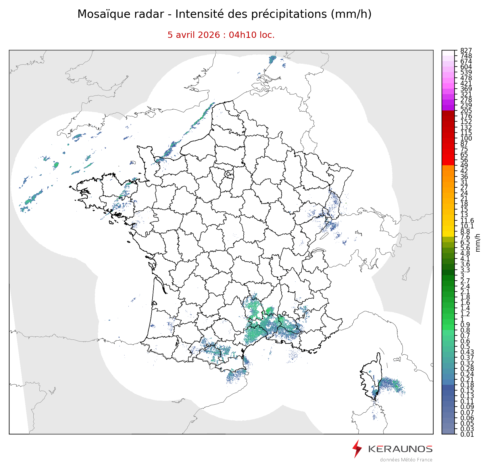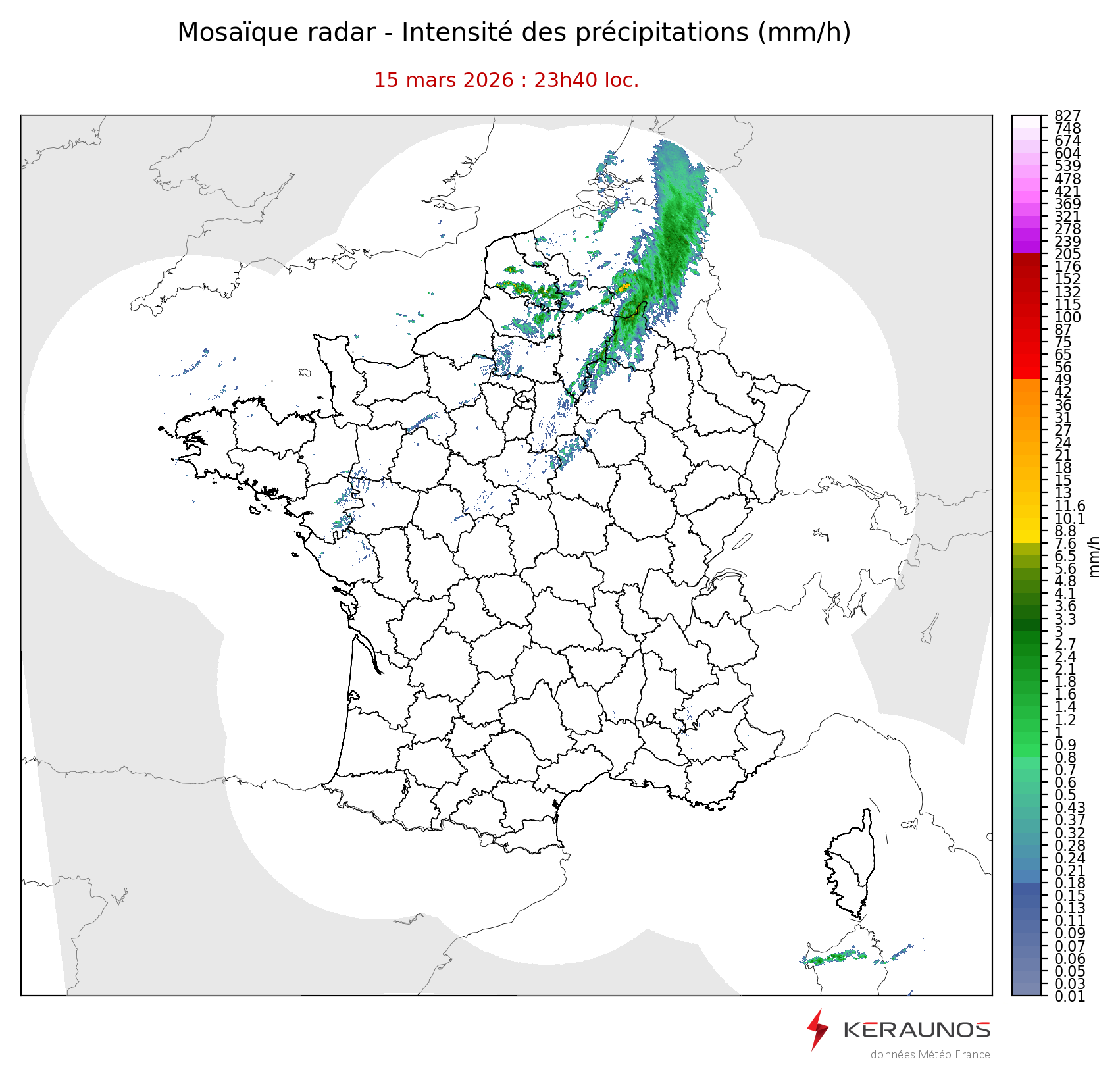 Mosaïque radar France Mosaïque lame d'eau Radars individuels Doppler Radar Europe 15 min Les mosaïques « radar France 5 minutes » fusionnent l’ensemble des données radars pour localiser précisément les précipitations sur la France. France entière Nord-Ouest Nord-Est Sud-Est Sud-Ouest Dernière heure 2 dernières heures 3 dernières heures 4 dernières heures 5 dernières heures 6 dernières heures Img préc. Play Img suiv. Générer GIF