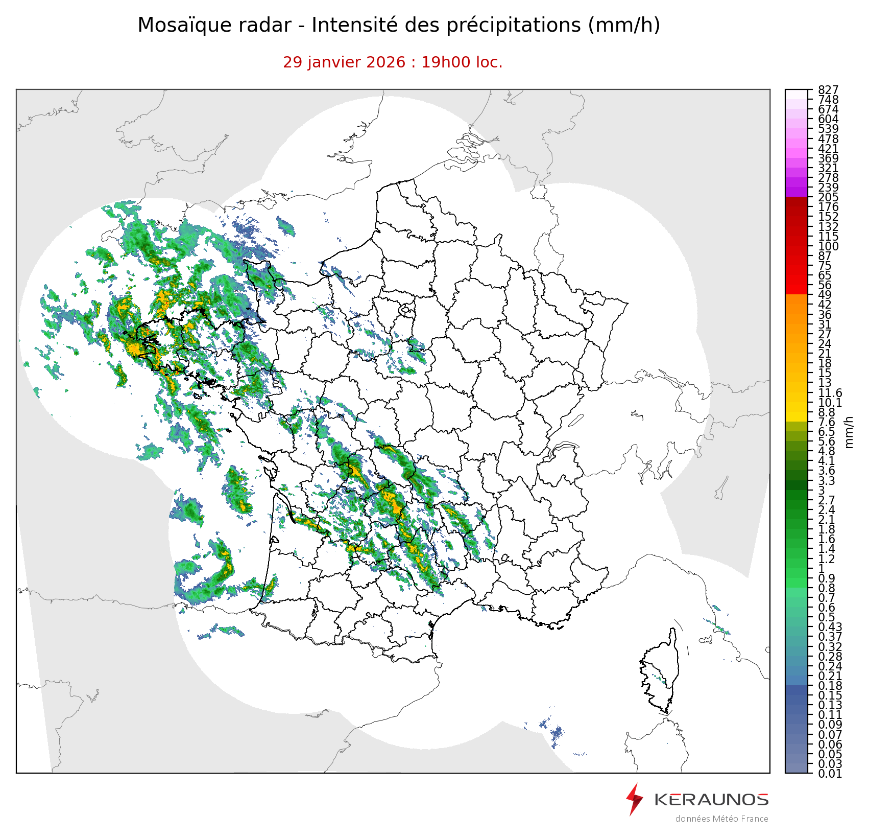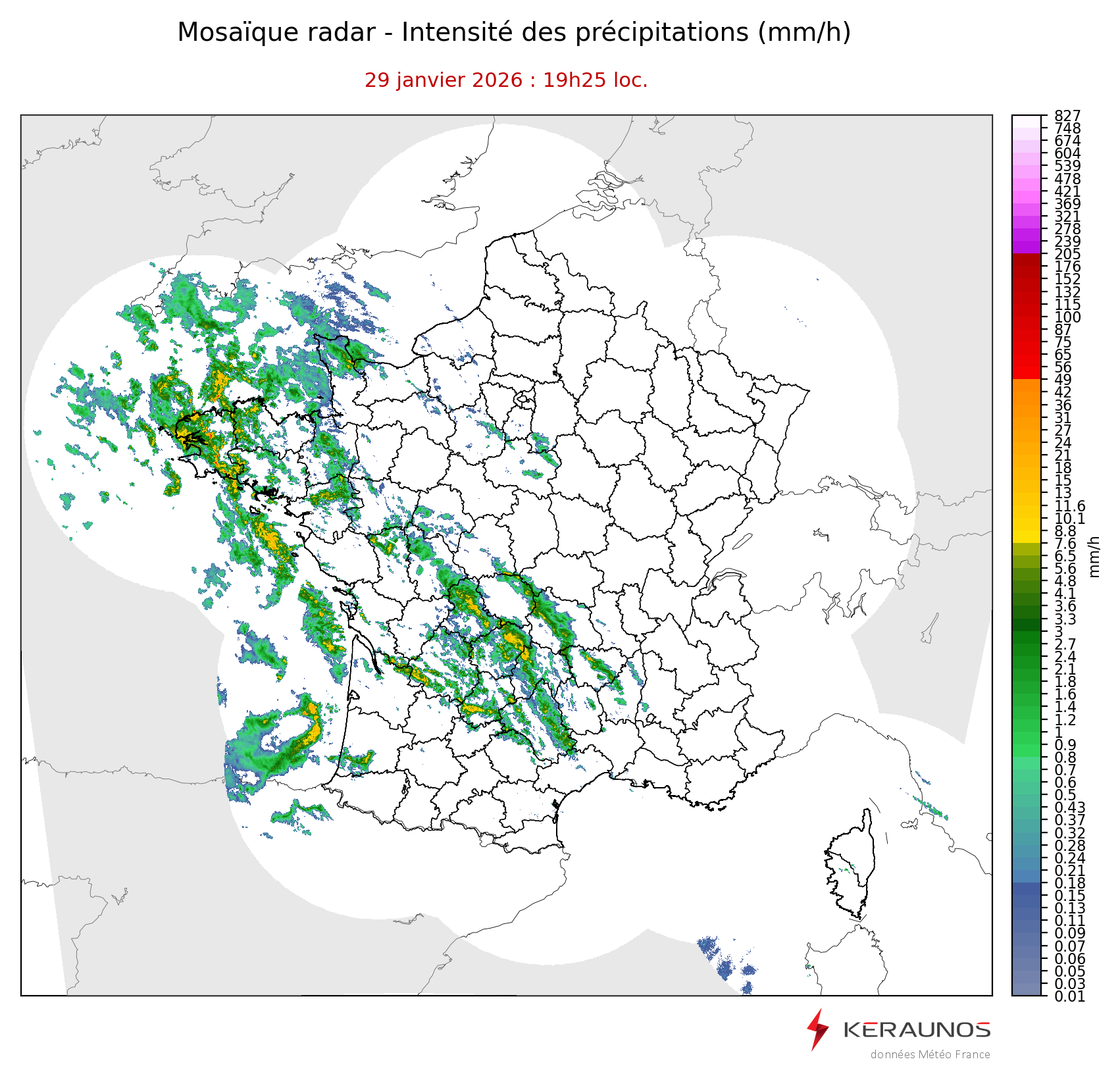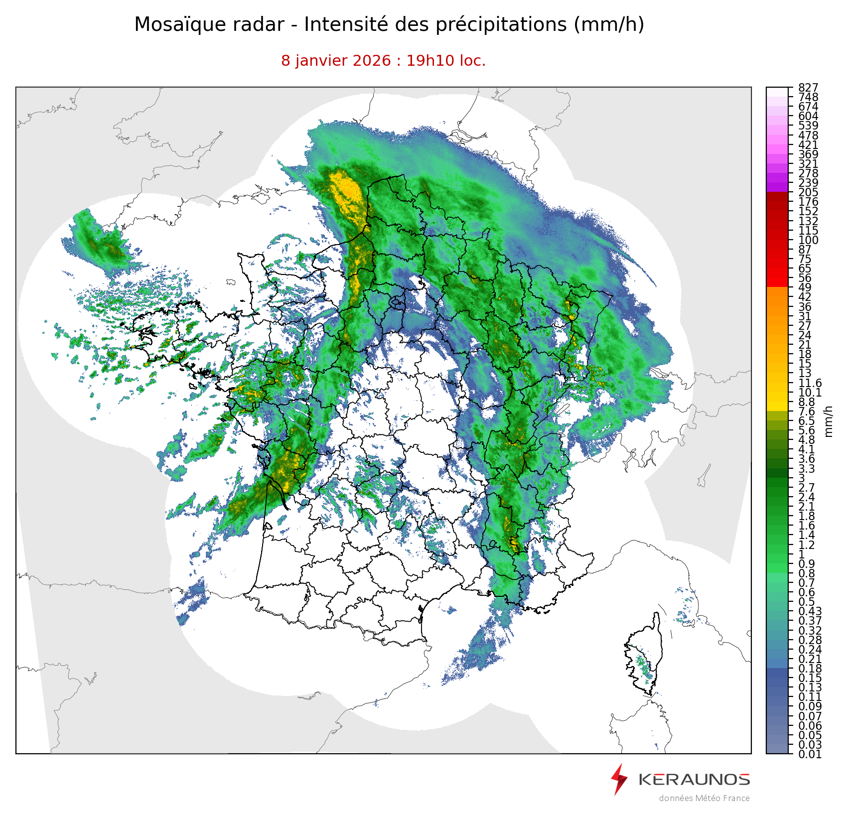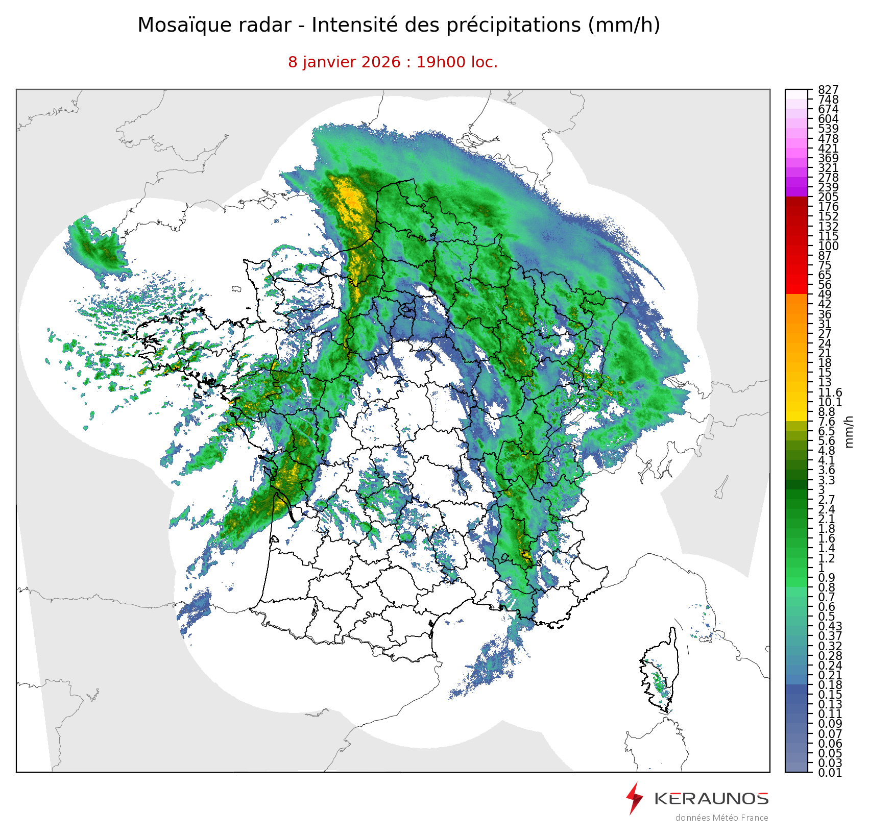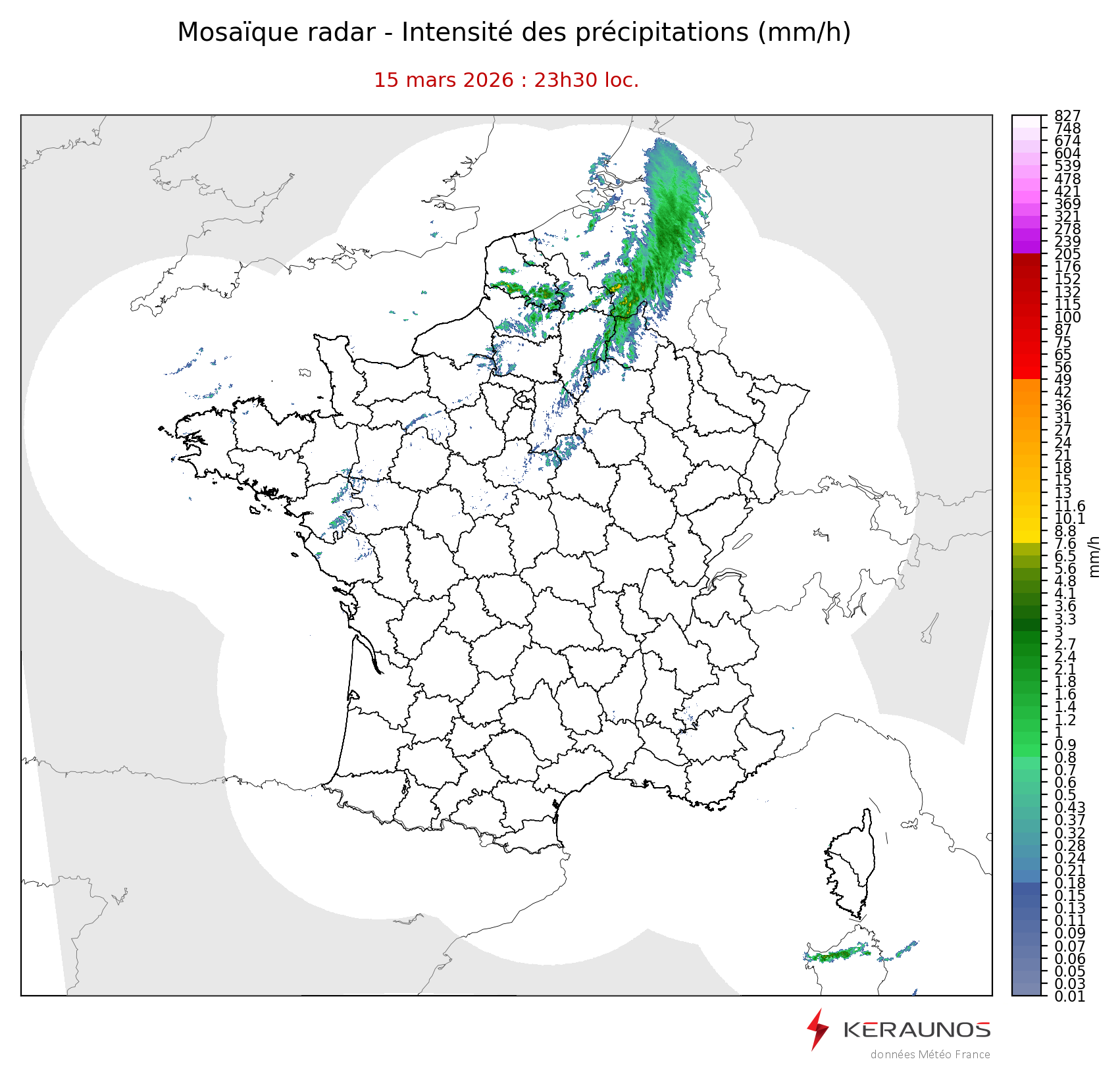Mosaïque radar France Mosaïque lame d'eau Radars individuels Doppler Radar Europe 15 min Les mosaïques « radar France 5 minutes » fusionnent l’ensemble des données radars pour localiser précisément les précipitations sur la France. France entière Nord-Ouest Nord-Est Sud-Est Sud-Ouest Dernière heure 2 dernières heures 3 dernières heures 4 dernières heures 5 dernières heures 6 dernières heures Img préc. Play Img suiv. Générer GIF