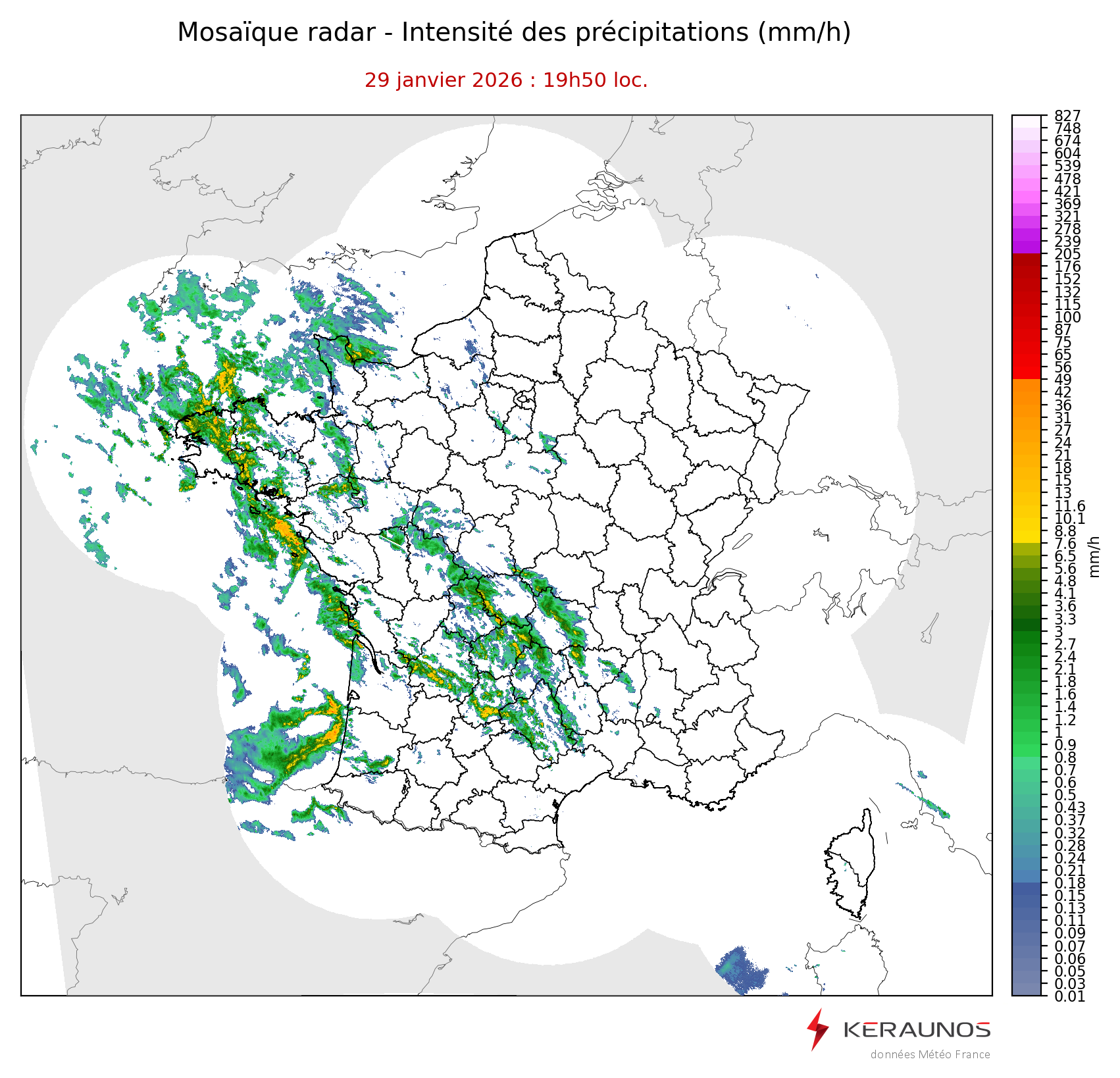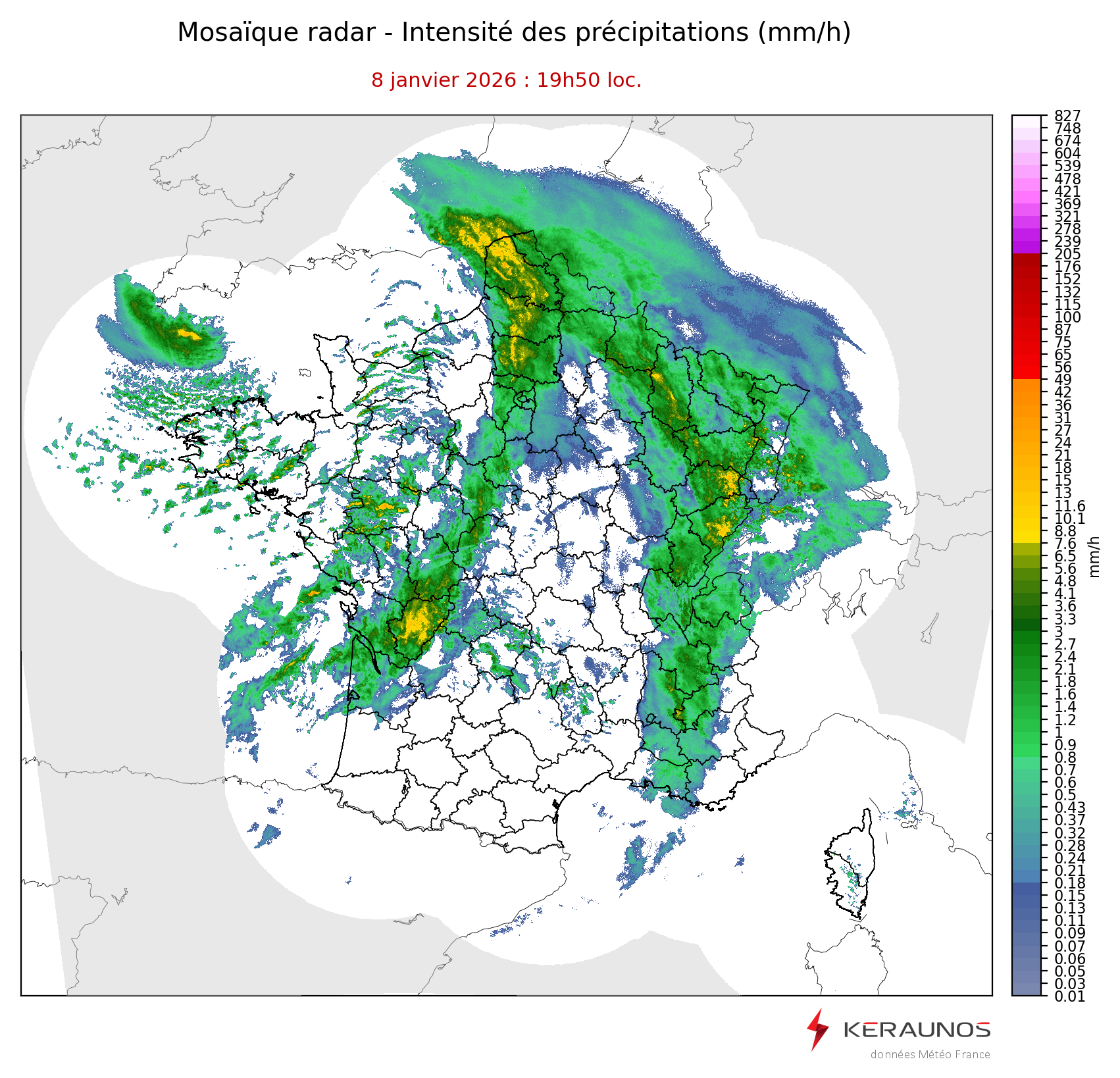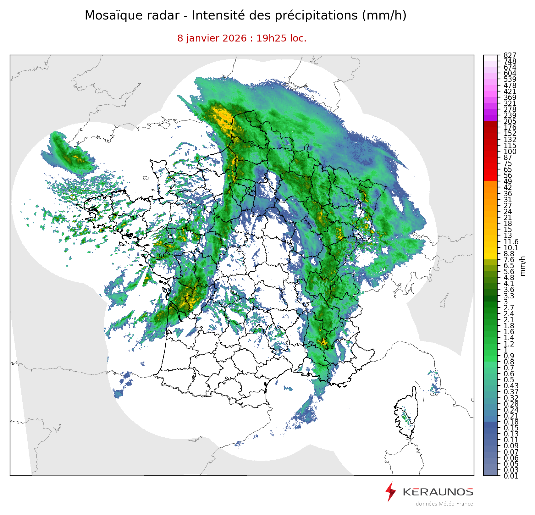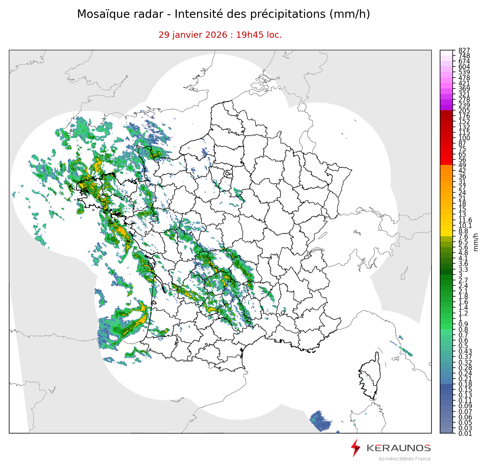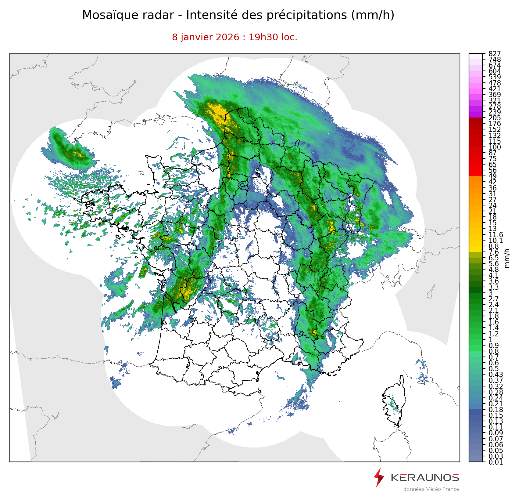 Mosaïque radar France Mosaïque lame d'eau Radars individuels Doppler Radar Europe 15 min Les mosaïques « radar France 5 minutes » fusionnent l’ensemble des données radars pour localiser précisément les précipitations sur la France. France entière Nord-Ouest Nord-Est Sud-Est Sud-Ouest Dernière heure 2 dernières heures 3 dernières heures 4 dernières heures 5 dernières heures 6 dernières heures Img préc. Play Img suiv. Générer GIF